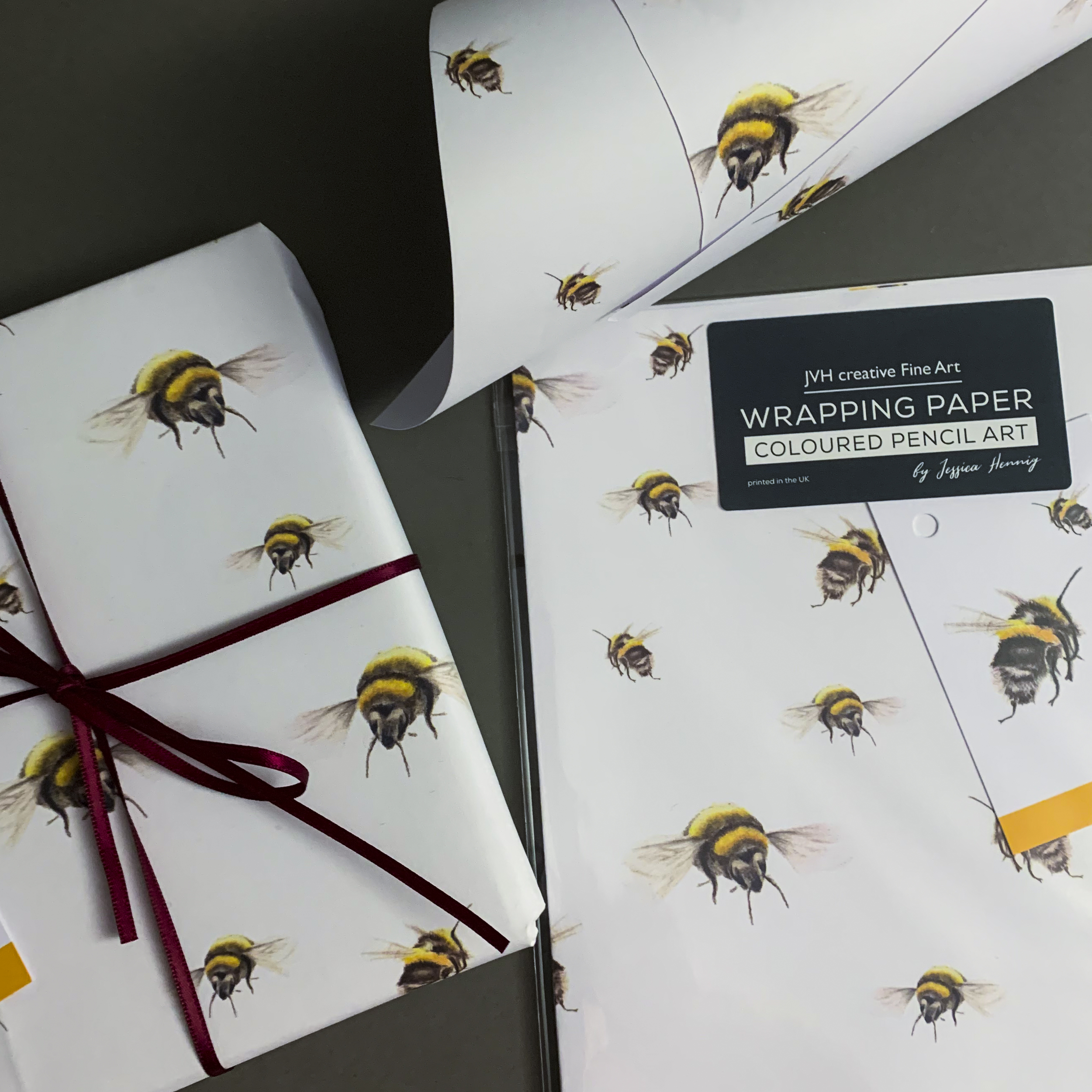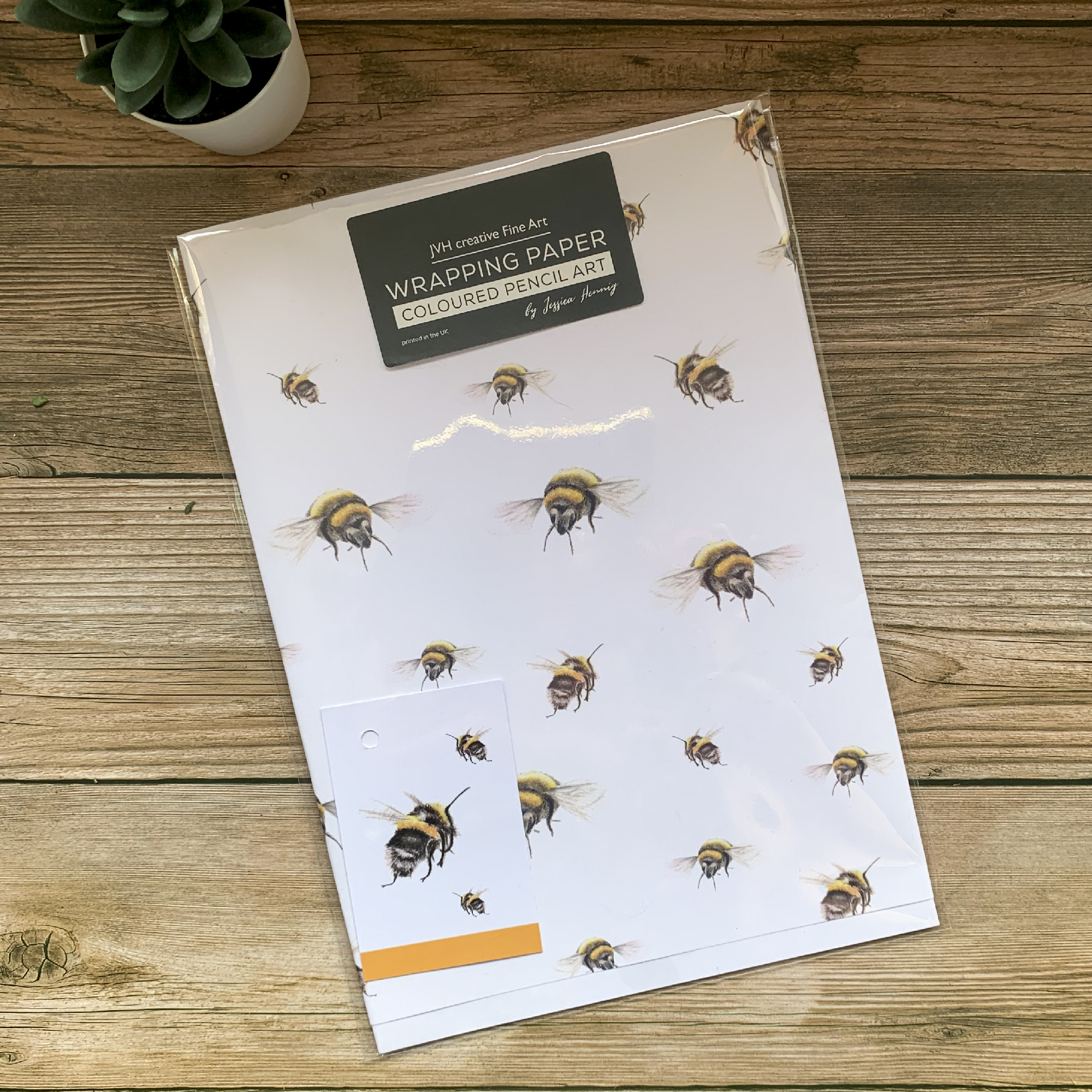 Quality, thick bee wrapping paper. Taken from my original coloured pencil bee drawings.
