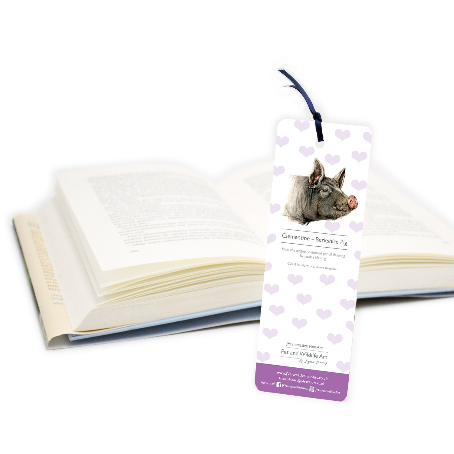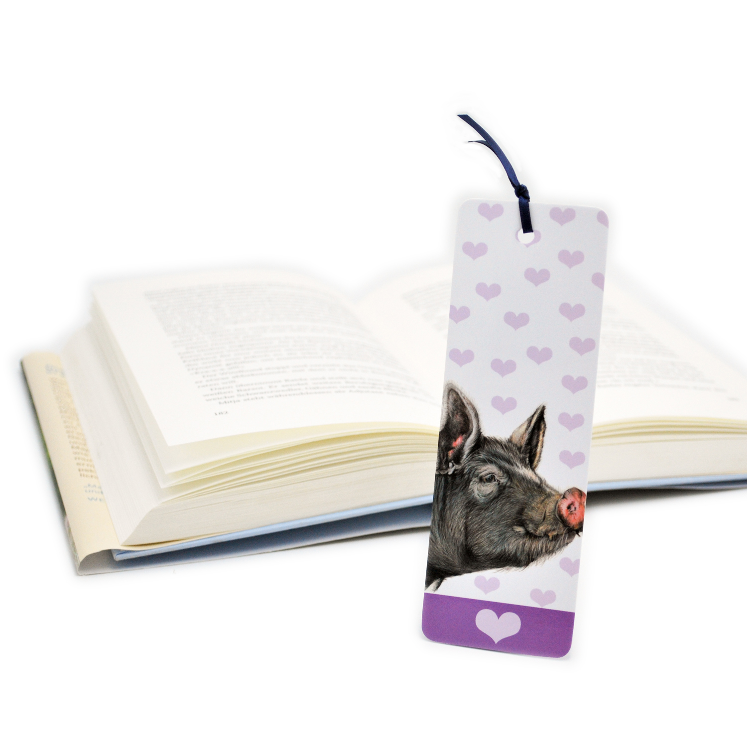 The bookmark has a cute background of little purple hearts, is printed on both sides and has a gloss finish.