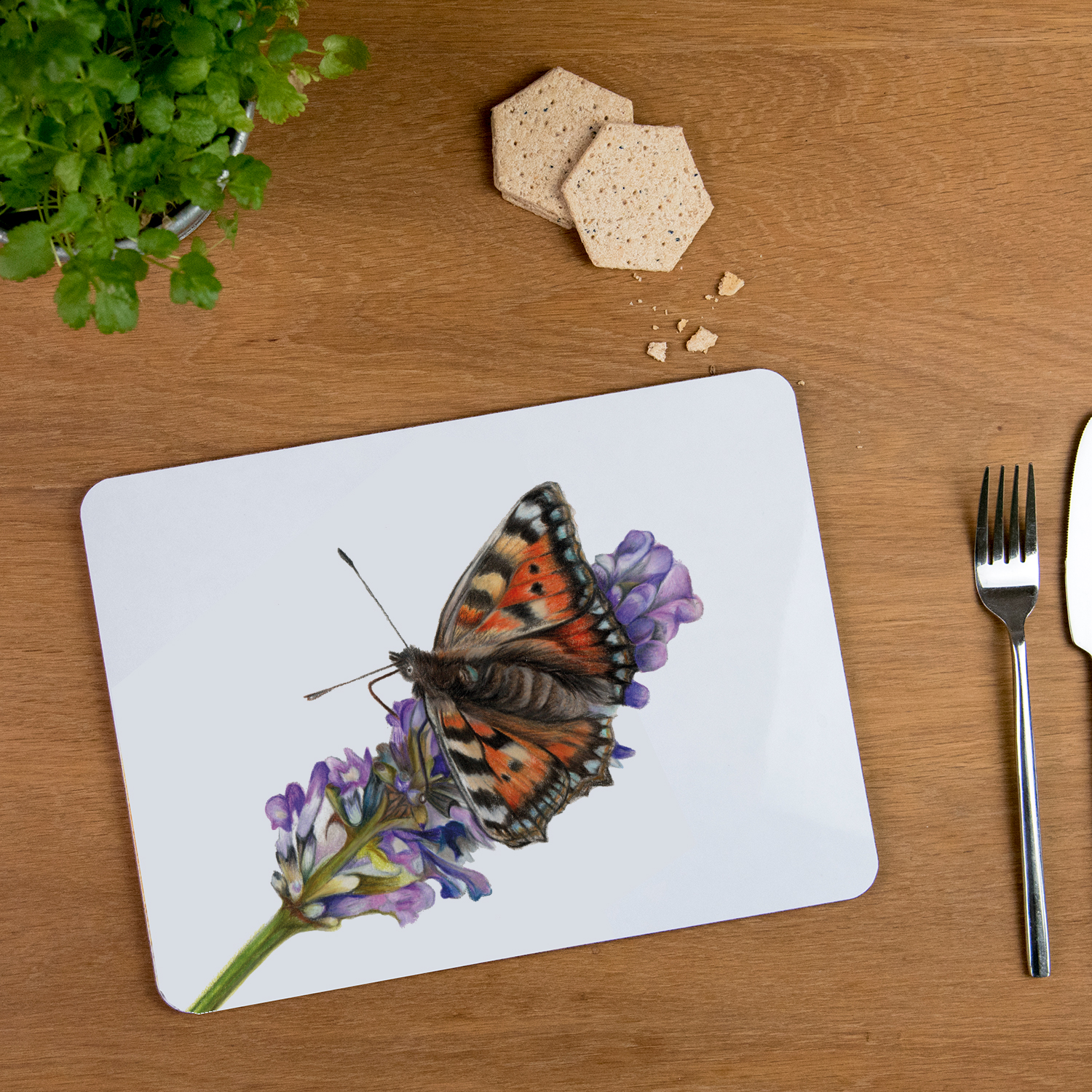 The Butterfly Placemat features Dippin’ in – the Small Tortoiseshell on lavender, botanical drawing. A great gift idea for birthdays or the next housewarming you are invited to.