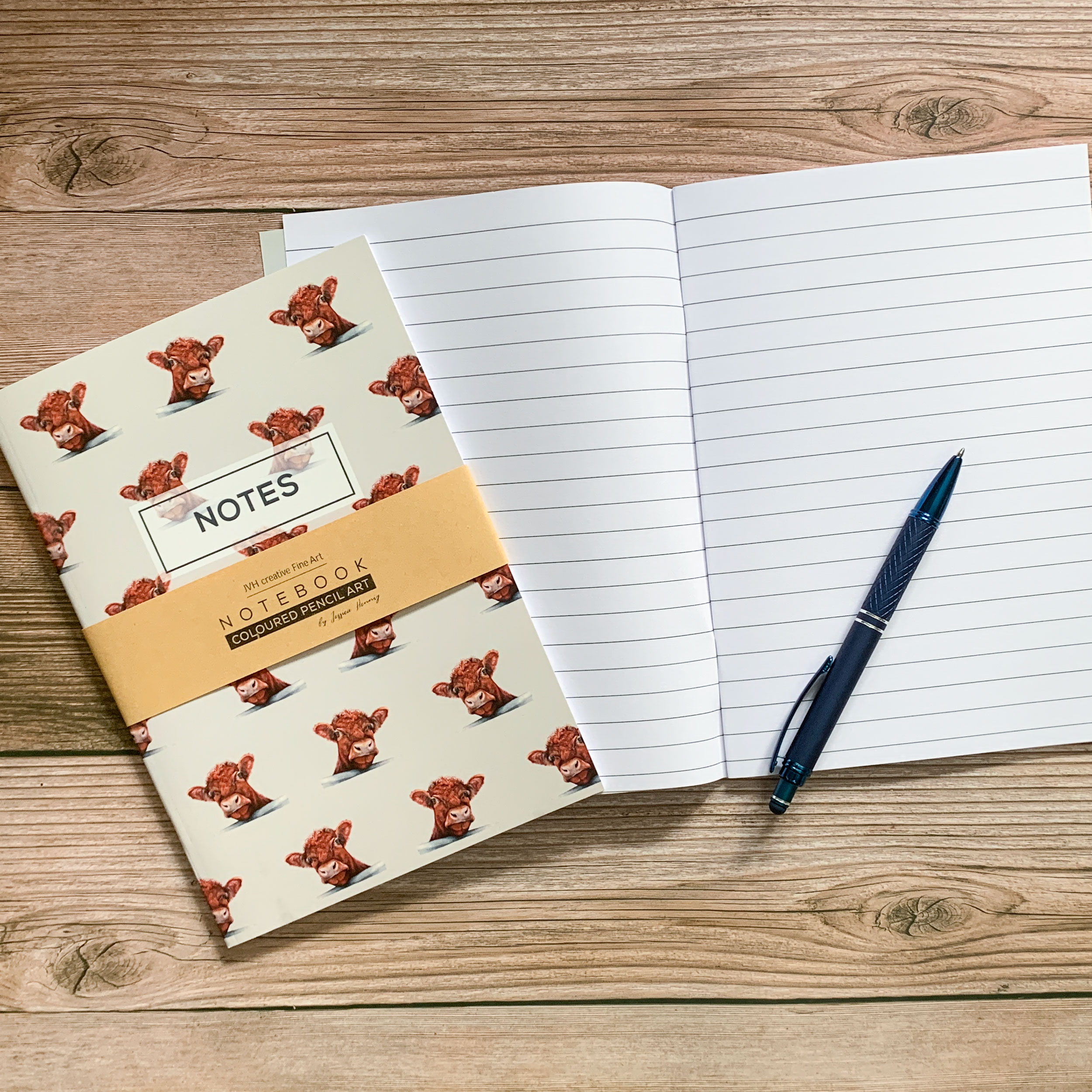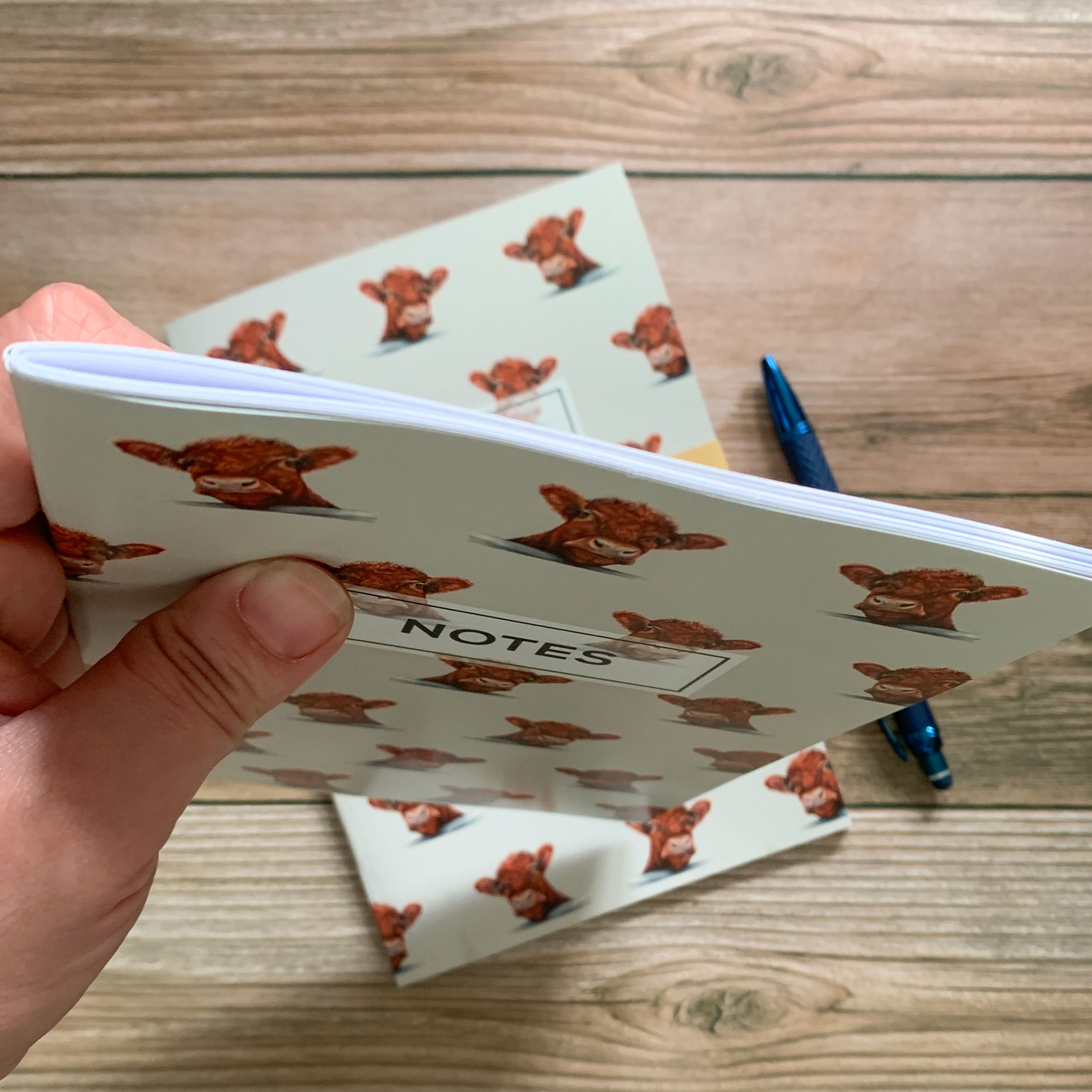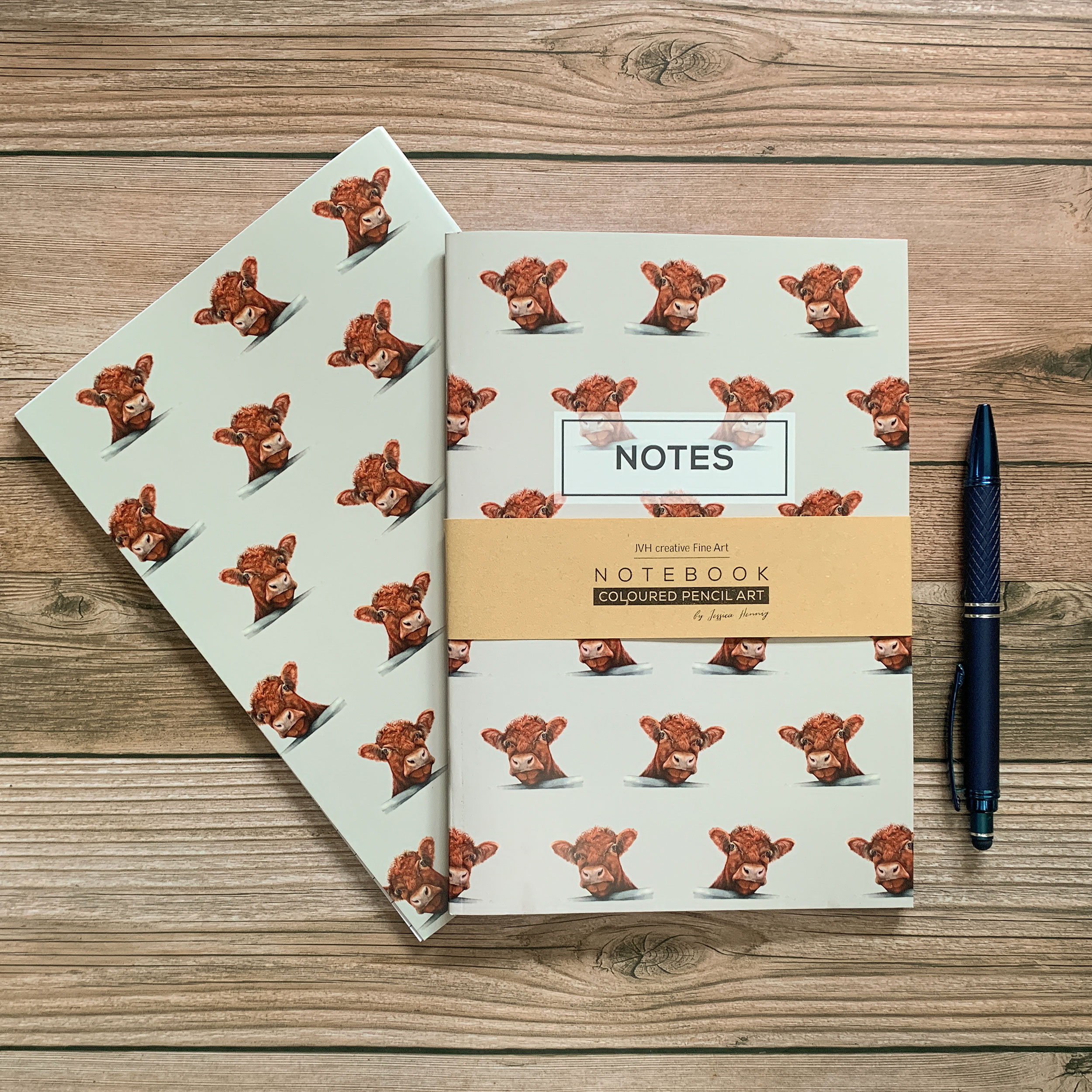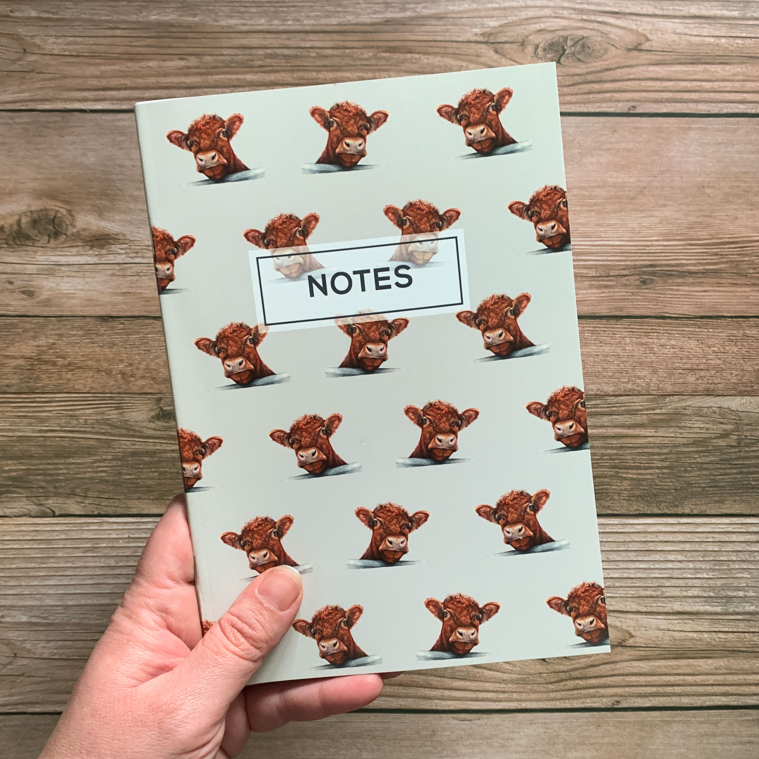 An A5 notebook with lined pages. The cover features a pattern print of my original coloured pencil drawing of Doris the Shorthorn Cow on a warm grey background. Perfect for all of your lists and creative ideas, to give as a gift or keep for yourself!