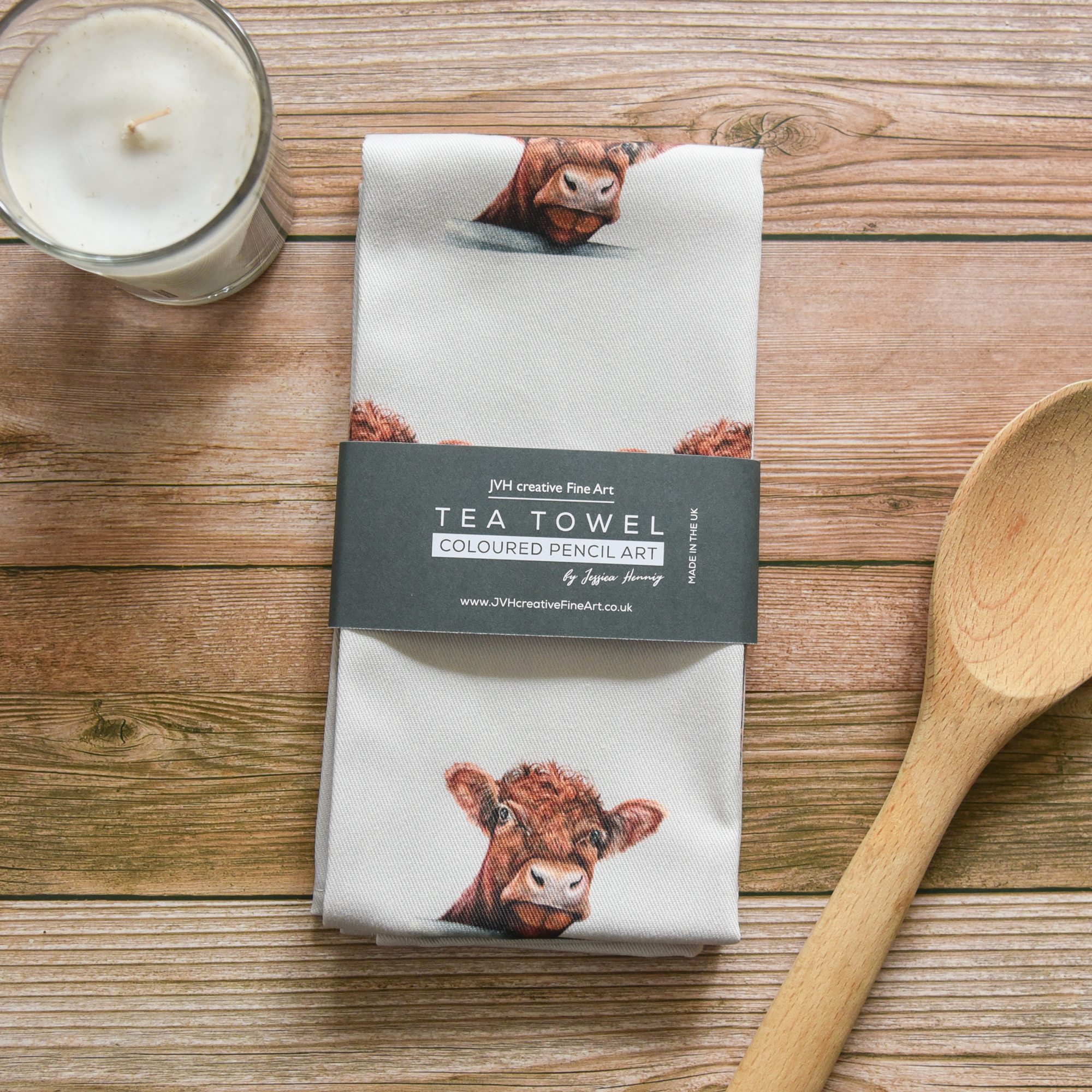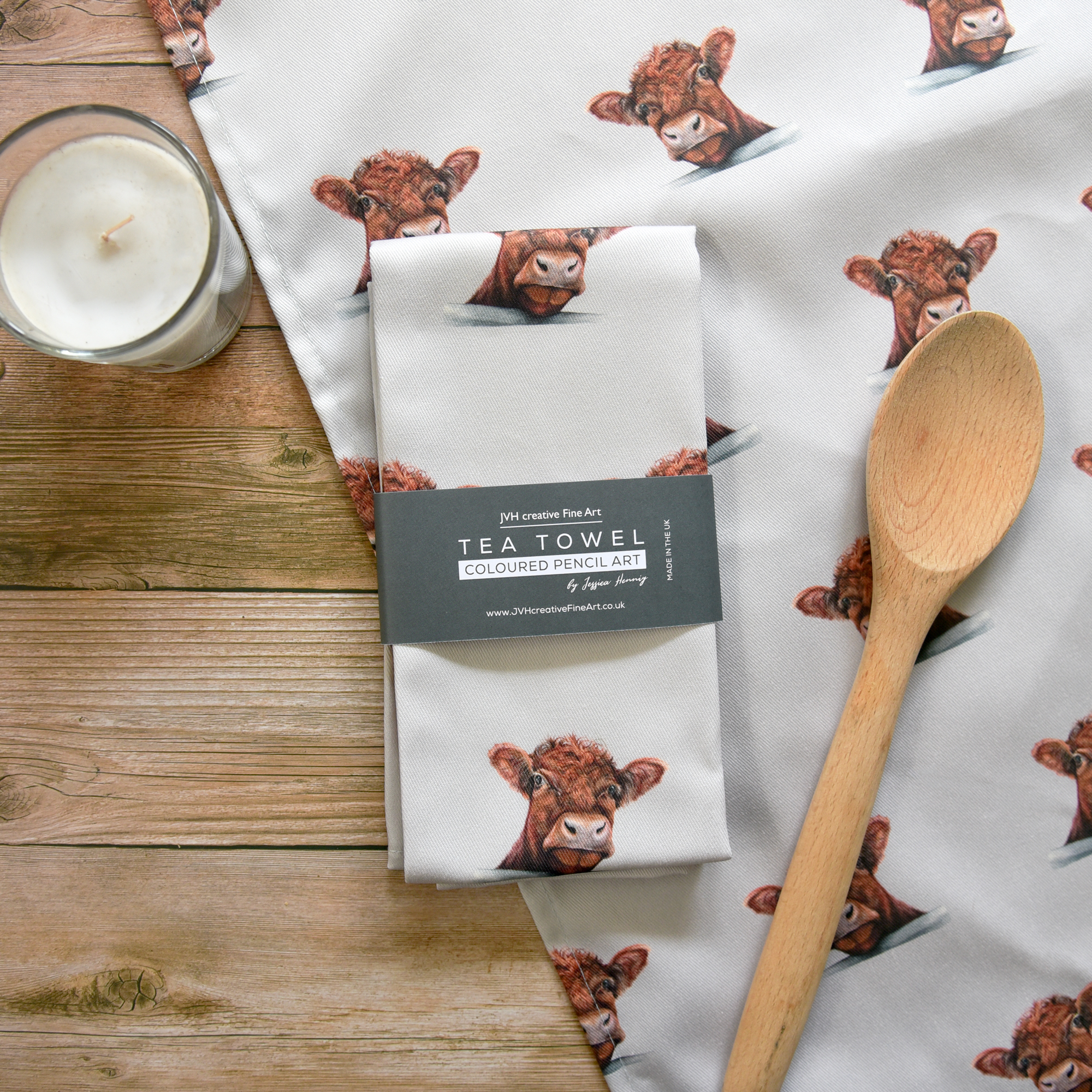 This Tea Towel is made of premium, white cotton drill. It features a pattern print of Doris the Shorthorn Cow on a warm grey background. Taken for one of my original coloured pencil drawings.
