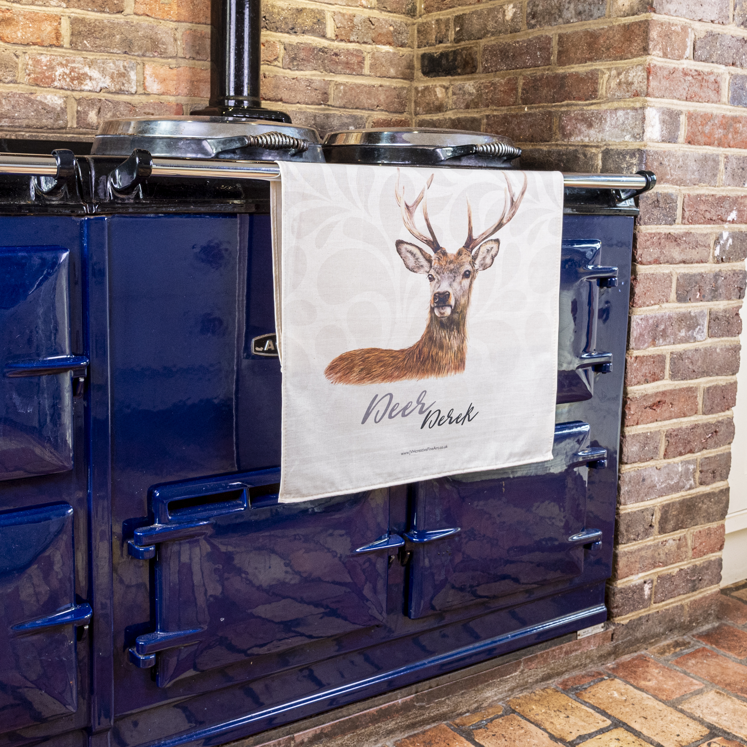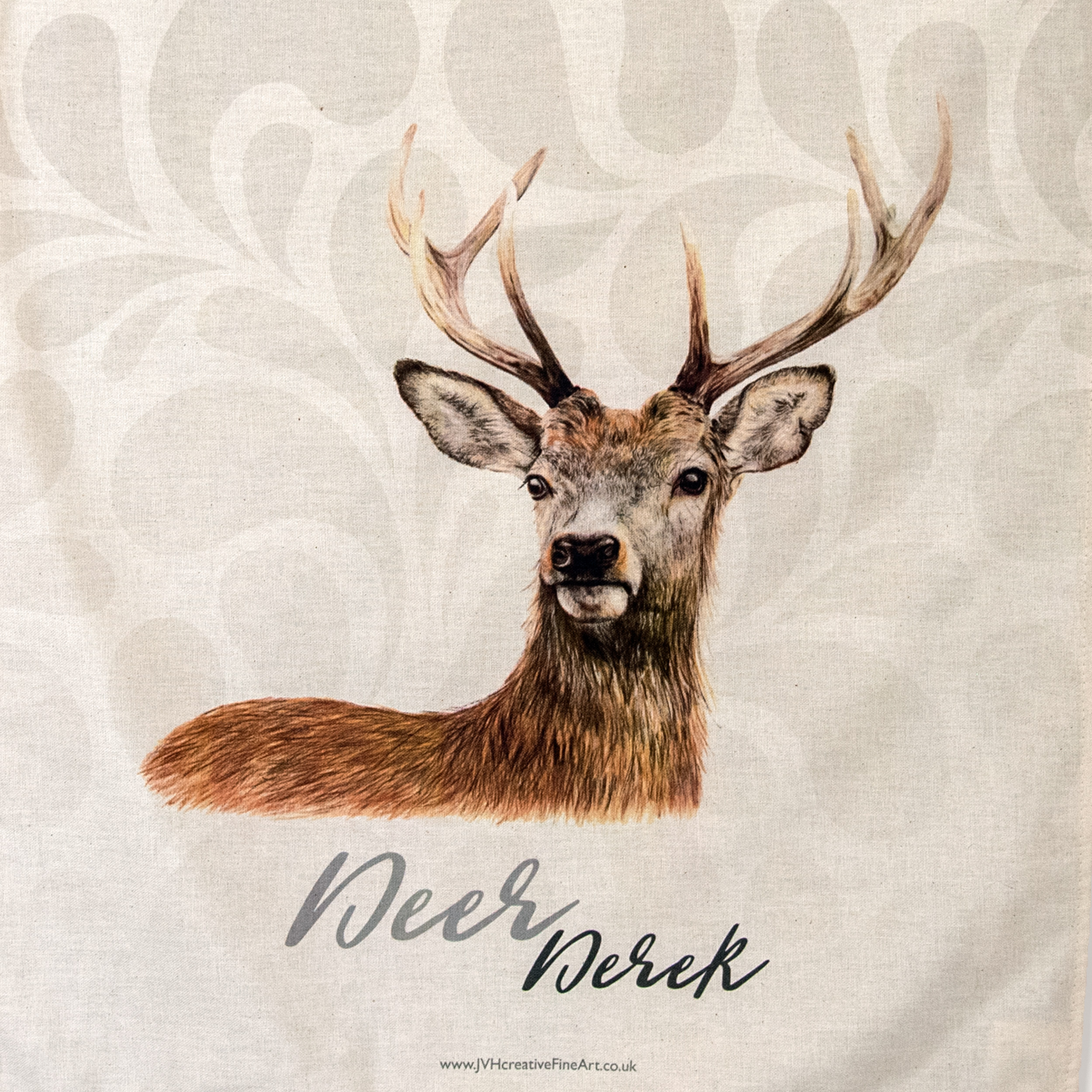 This Tea Towel is made of premium, natural coloured cotton. It features a print of Derek the Deer, an original coloured pencil drawing by Jessica Hennig.