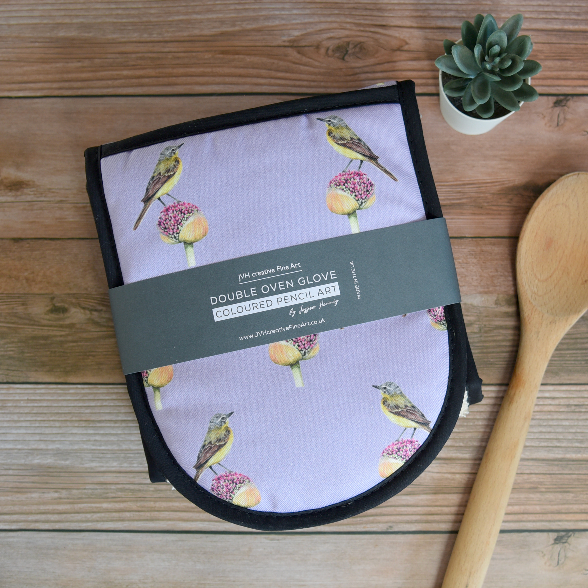 The Thick Double Oven Glove features a pattern print, of my original coloured pencil drawing of Yannis the Yellow Wagtail resting on an Allium on a light purple background.