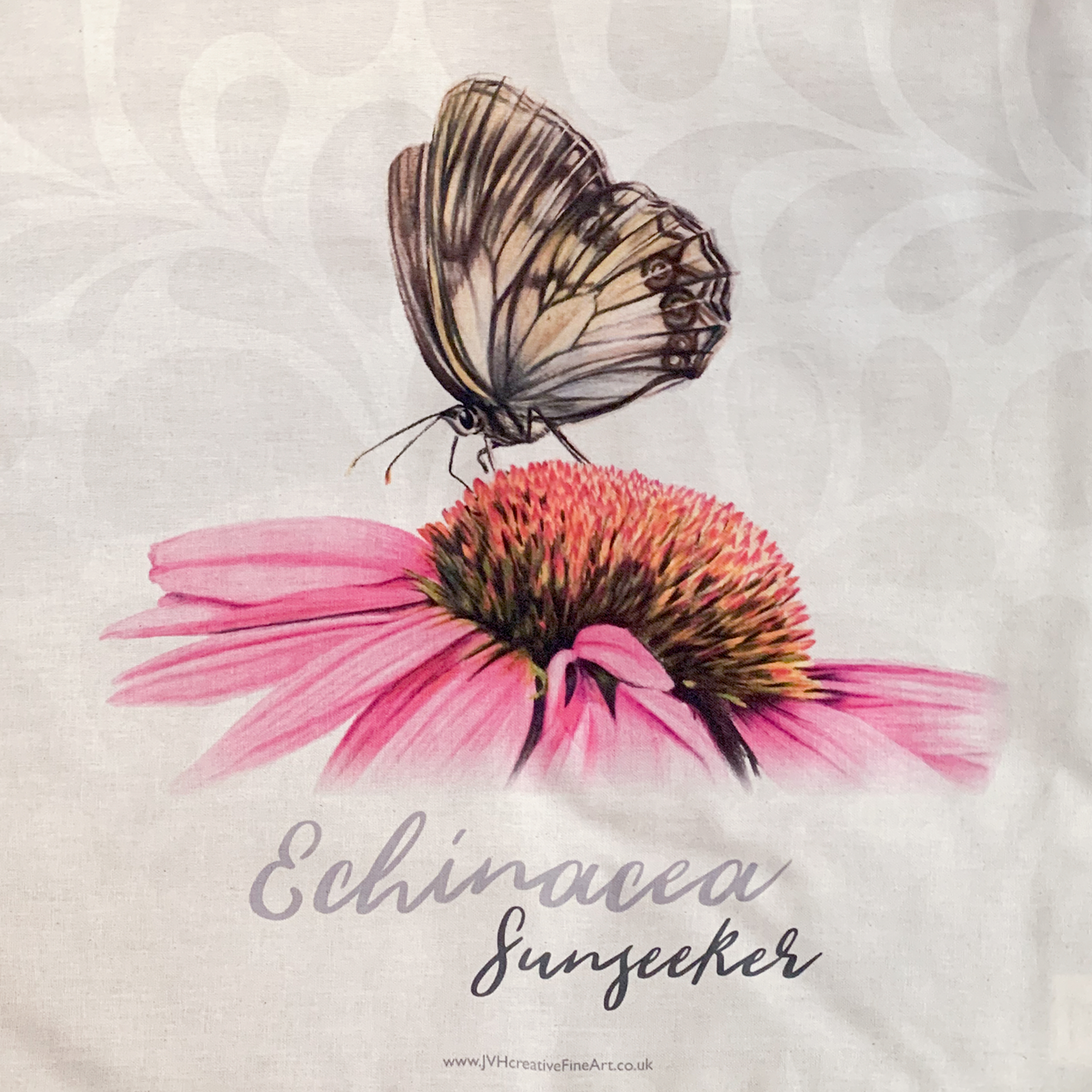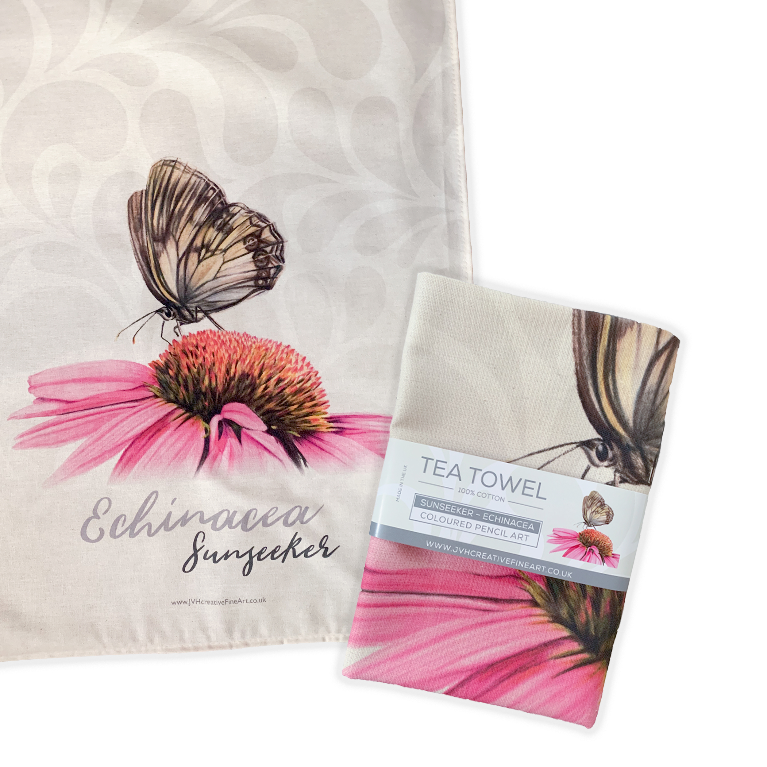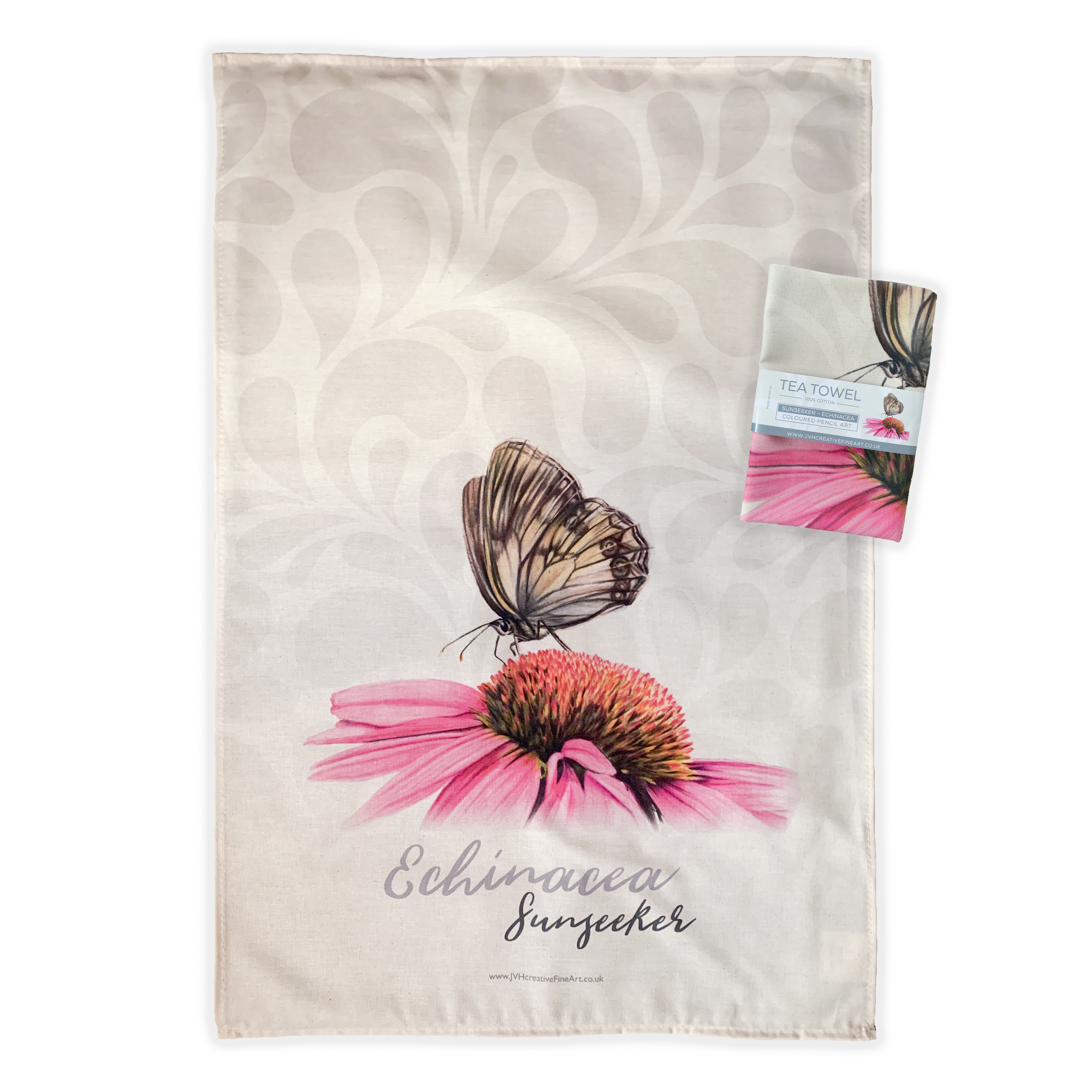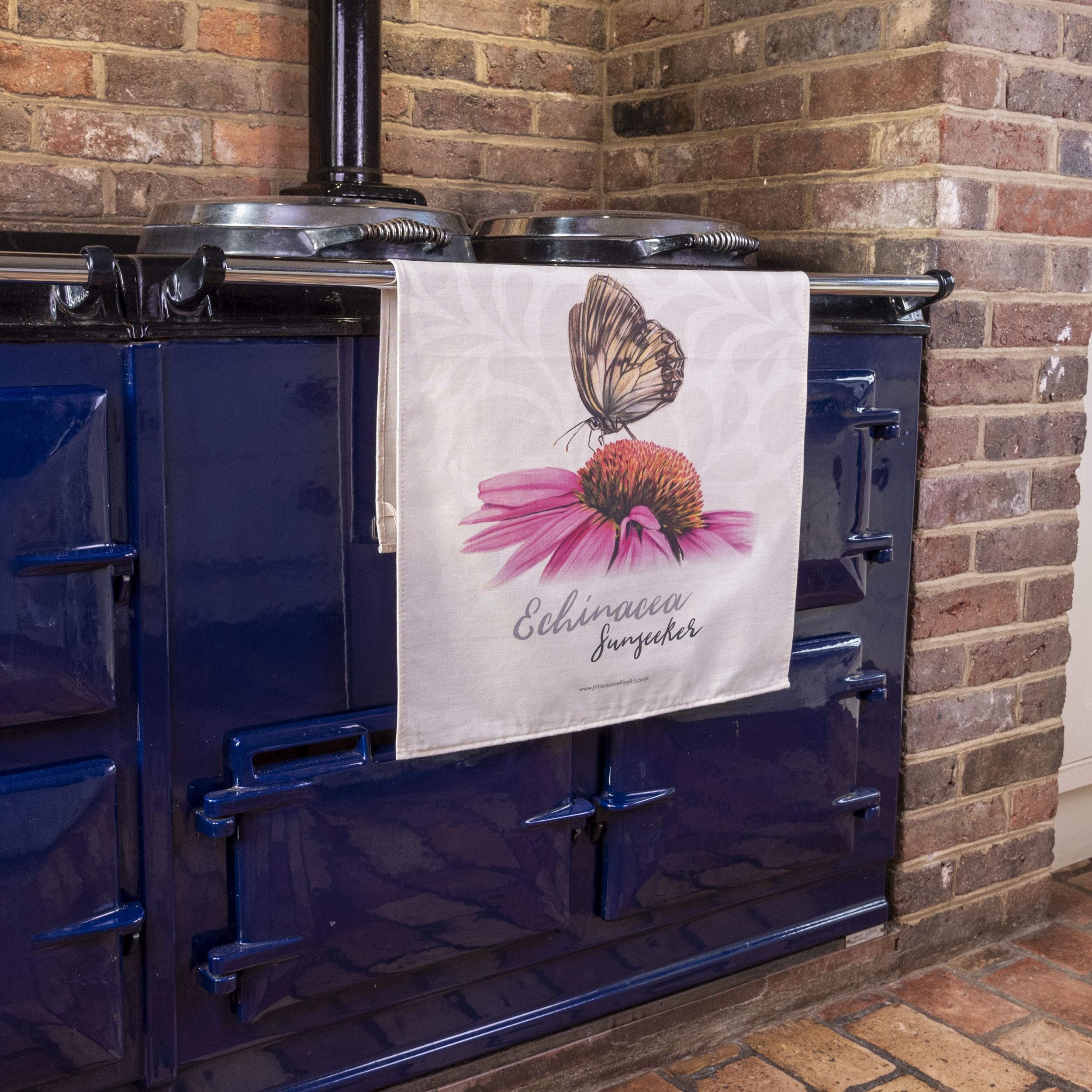 Who doesn’t like the look of an Echinacea?! With their large, colourful petals they add so much colour to your garden and attract a lot of useful insects. This is sunseeker, the drawing of an Echinacea with Butterfly – The colourful Tea Towel will bring the nature to your home and sure add some colour to your kitchen.