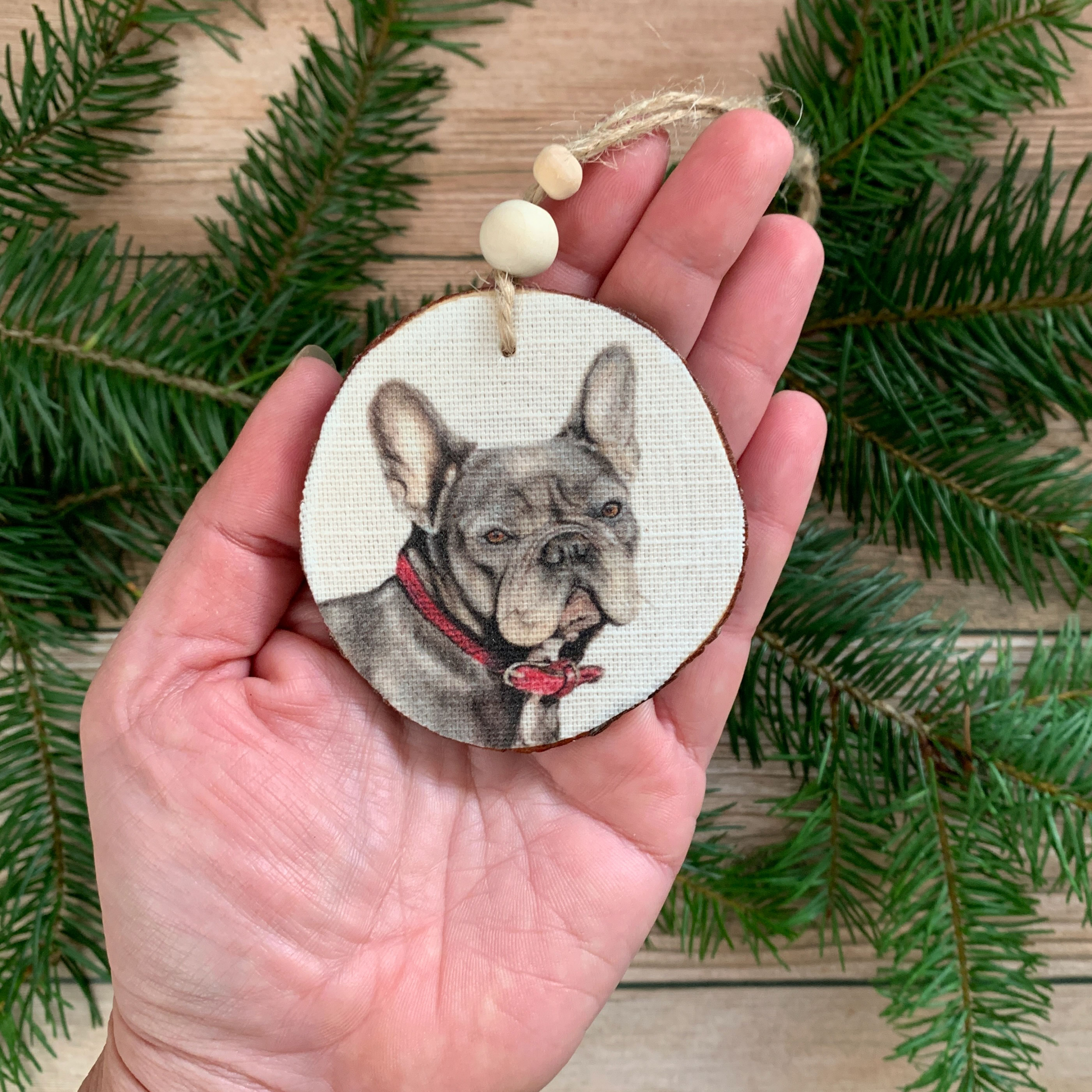 Maus, French Bulldog Wooden Ornaments ready to hang.