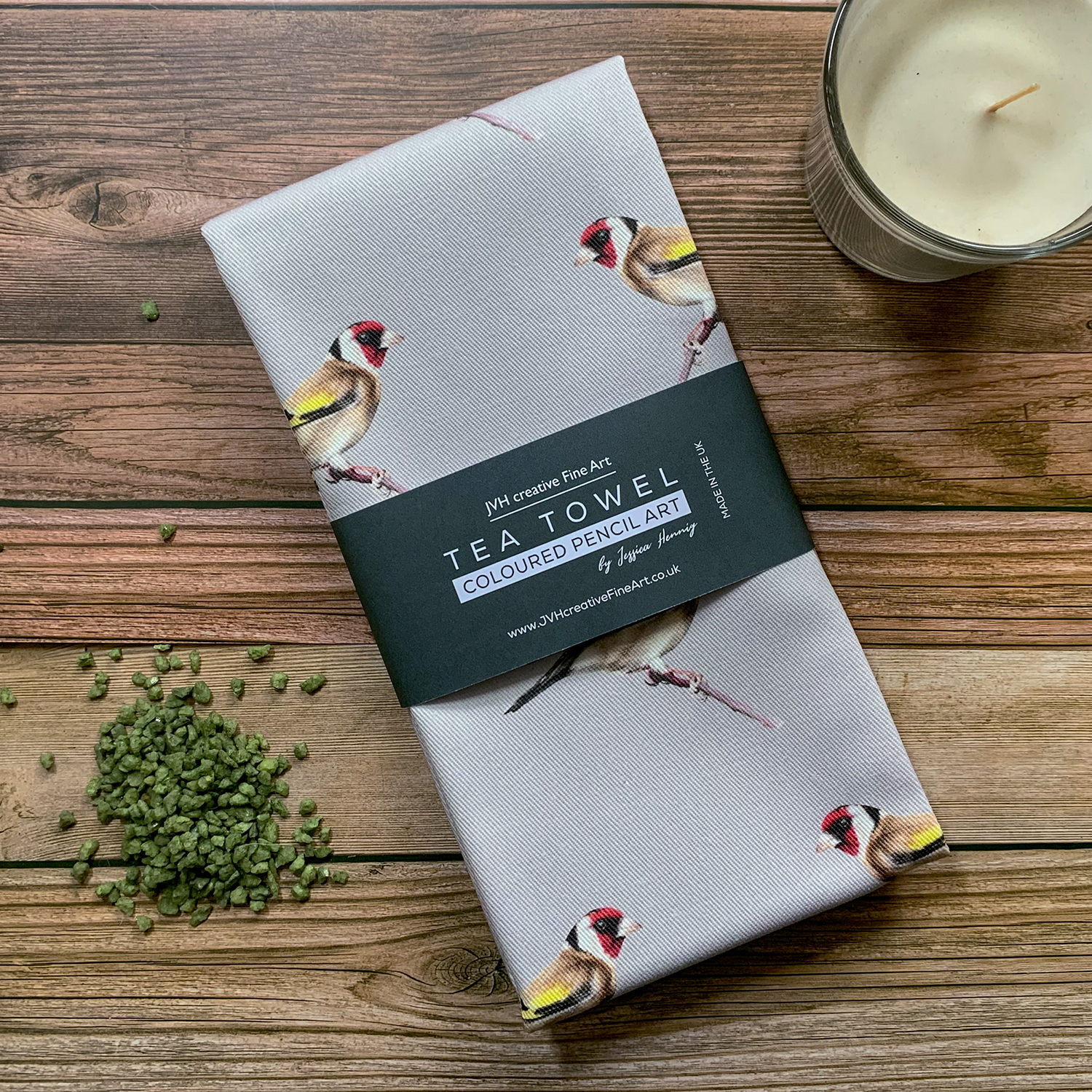 This Tea Towel is made of premium, white cotton drill. It features a pattern print of Gilbert the Goldfinch on a light grey background. Taken for one of my original coloured pencil drawings.