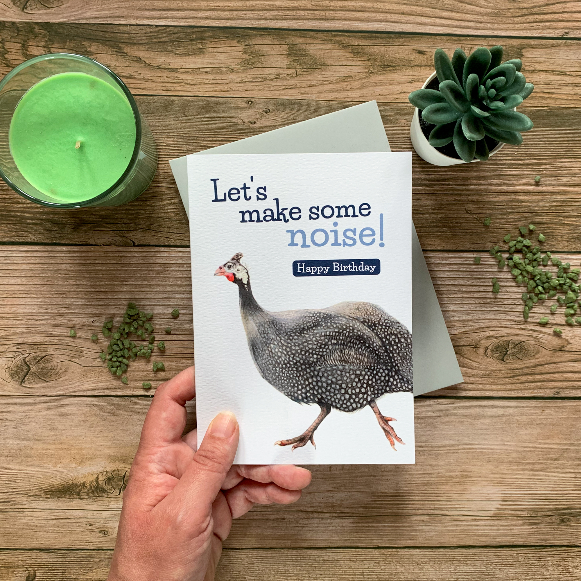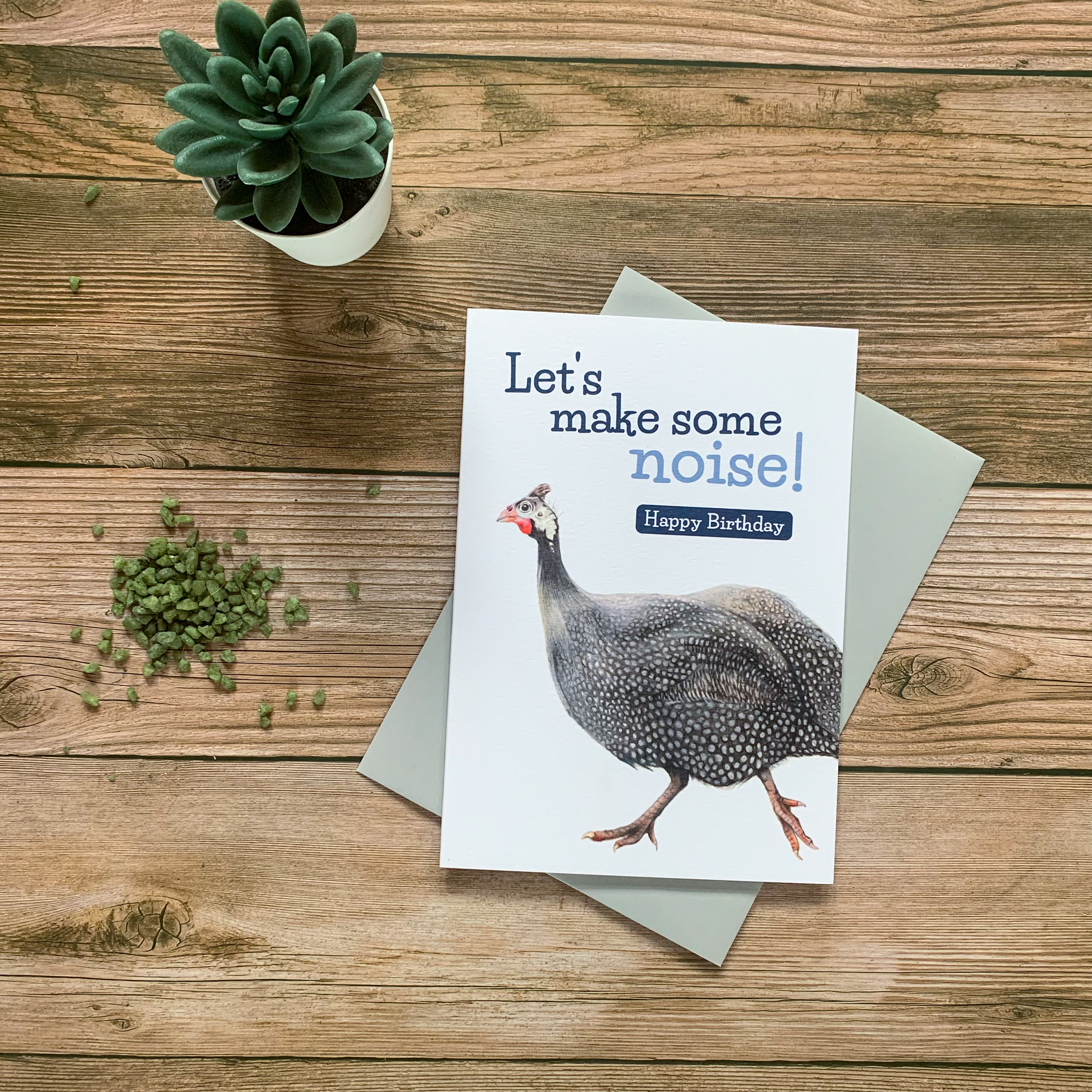 Make Some Noise! Gunnar the Guinea Fowl is wishing a happy birthday. Gunnar is taken from my original coloured pencil drawing.