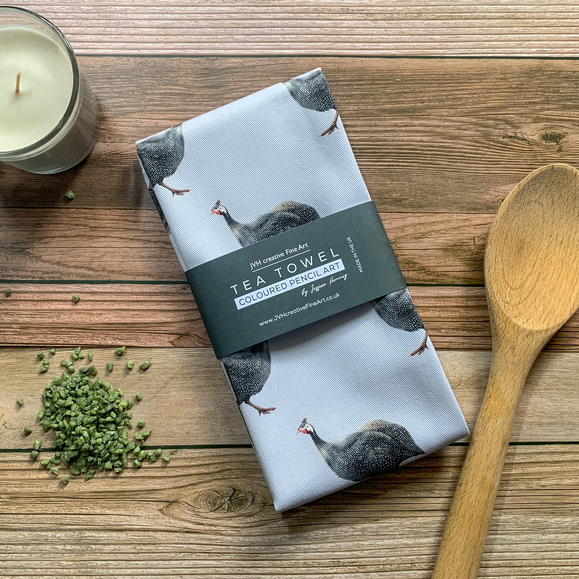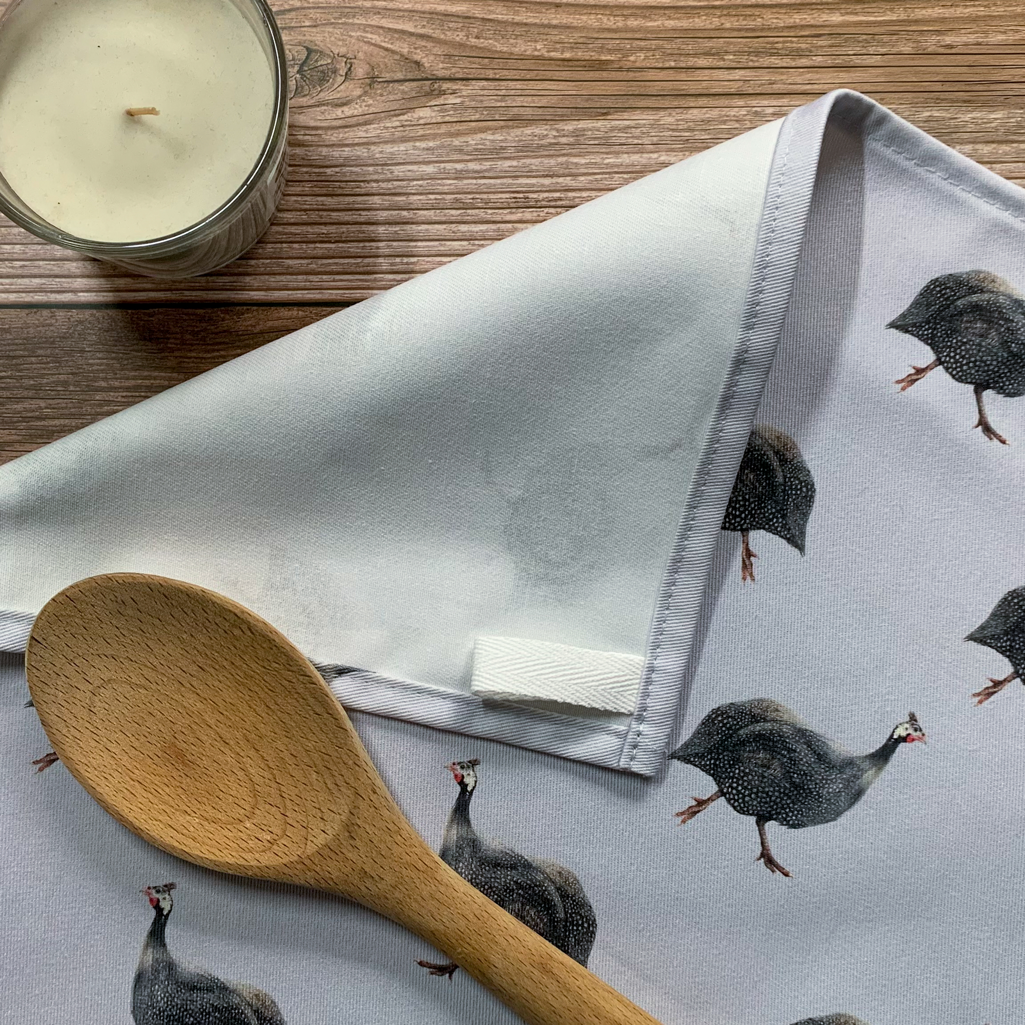 This Tea Towel is made of premium, white cotton drill. It features a pattern print of Gunnar the Guinea Fowl, featured on a grey or plain white background. Taken for one of my original coloured pencil drawings.
