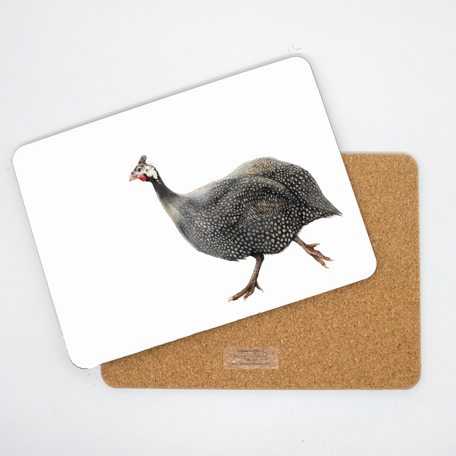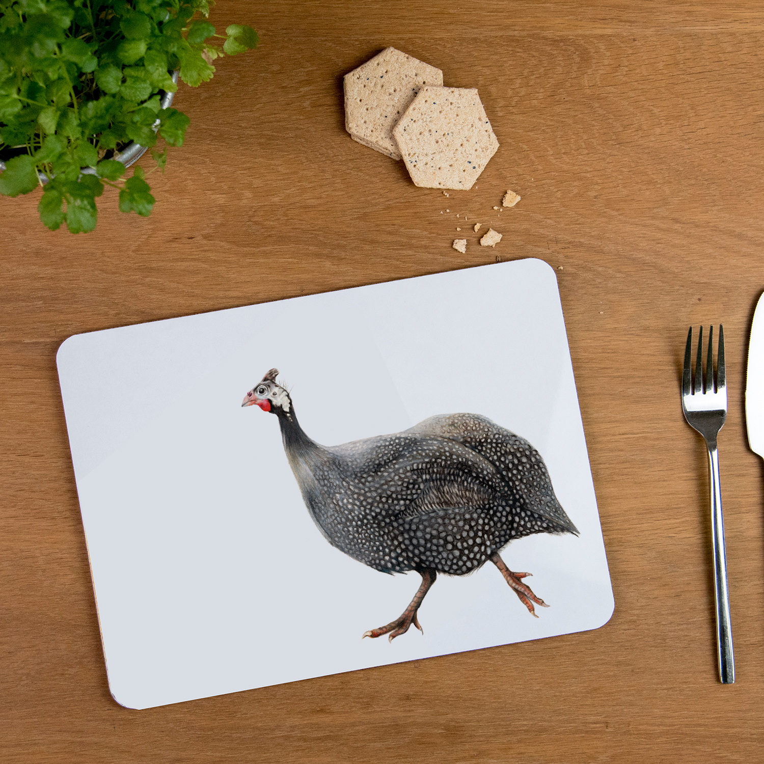 This is Gunnar the Guinea Fowl featured on our placemats. These placemats not only help to protect your dinner table form heat damage, spills or scratches, but also add some colour to your home. – A great gift idea for birthdays or the next housewarming you are invited to.