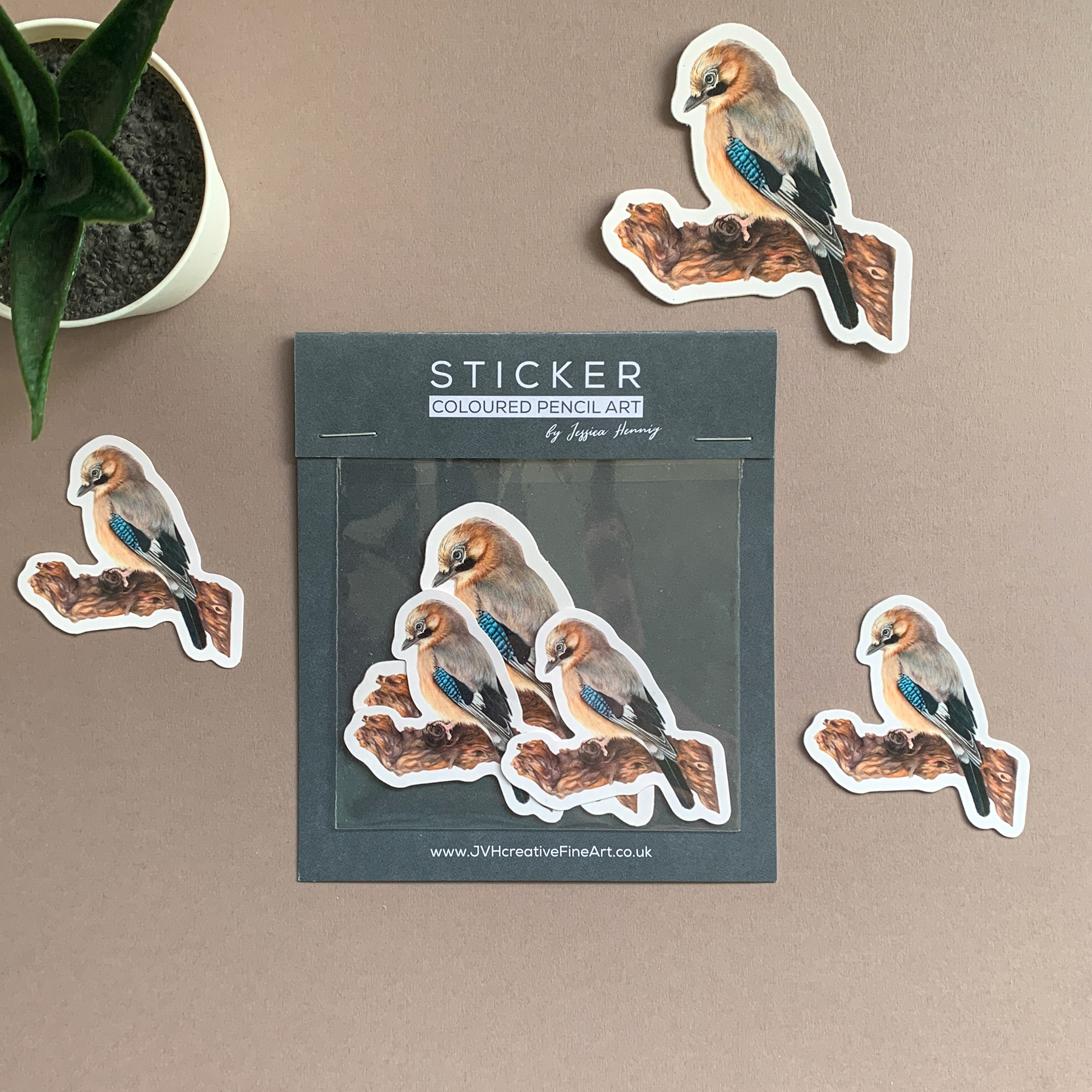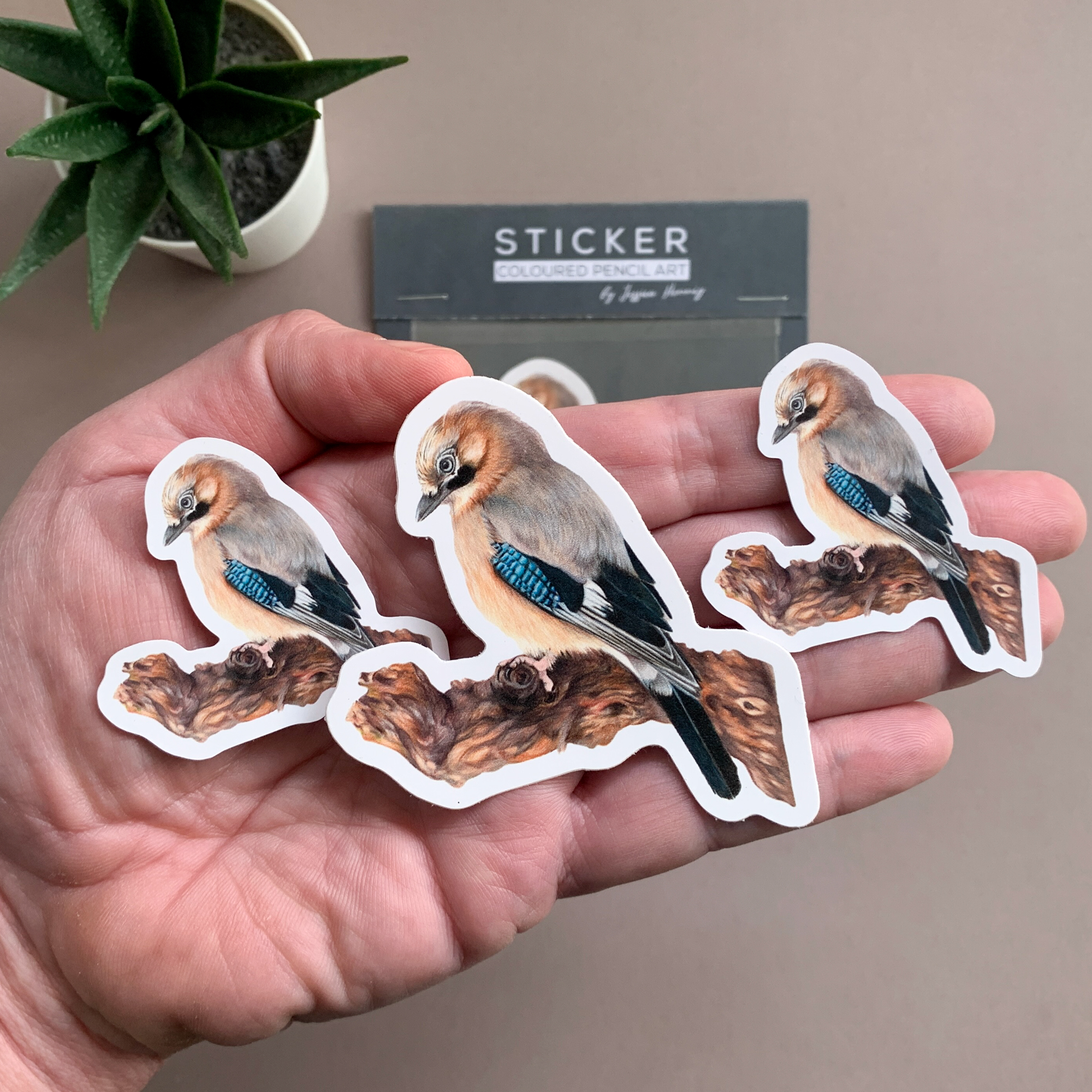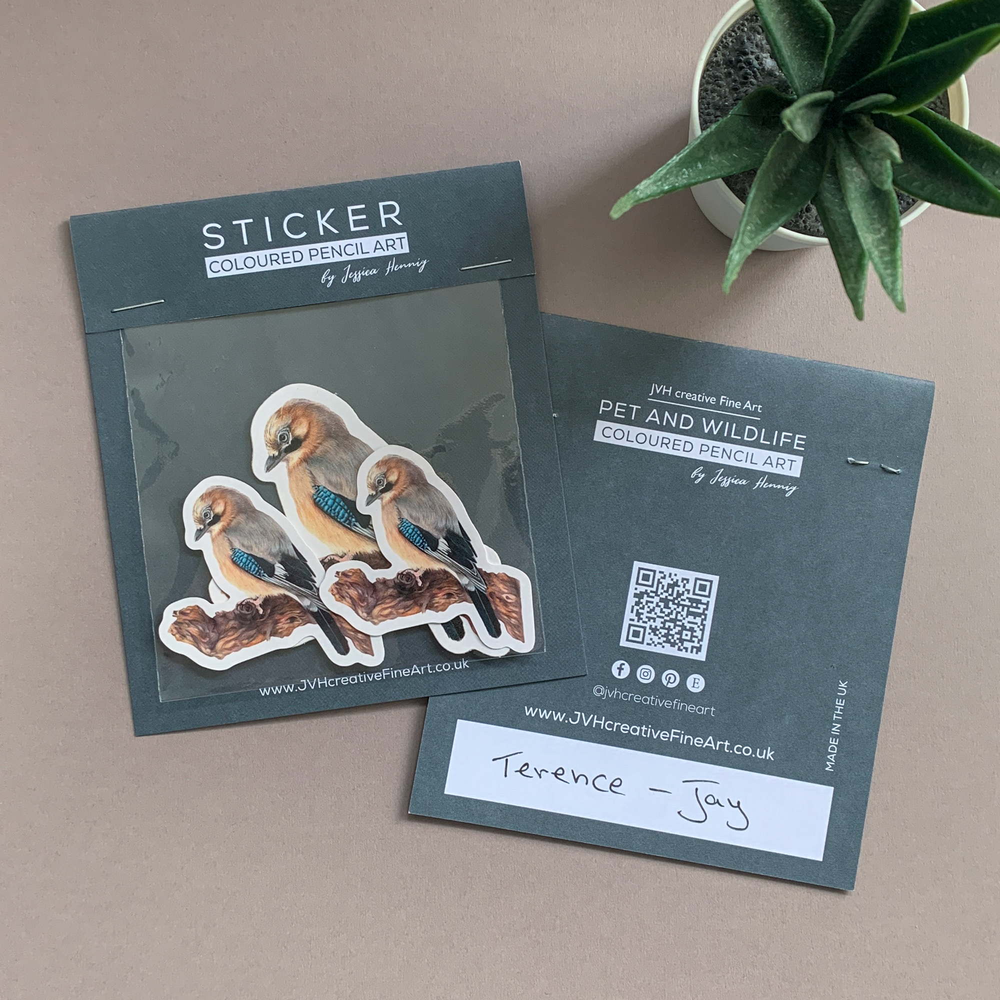 A set of three, durable, glossy vinyl stickers of Terence the Jay Bird. The image is taken from my original coloured pencil drawing.
