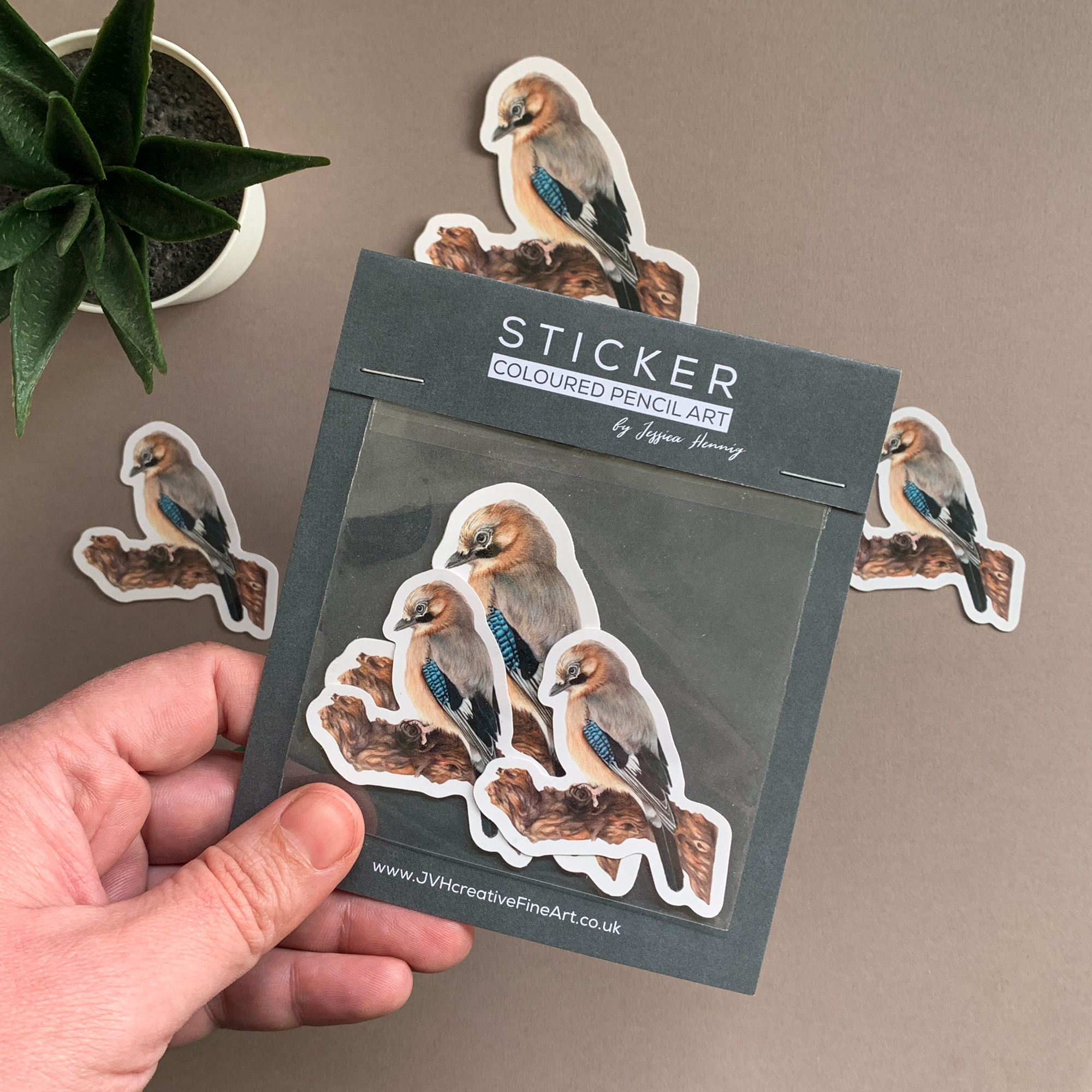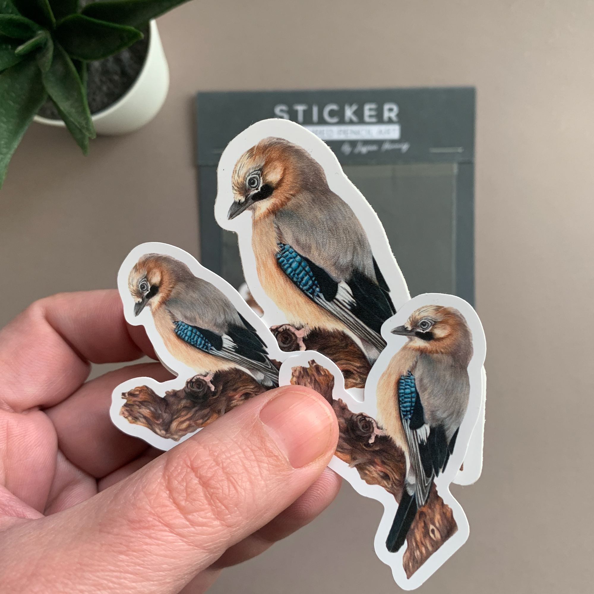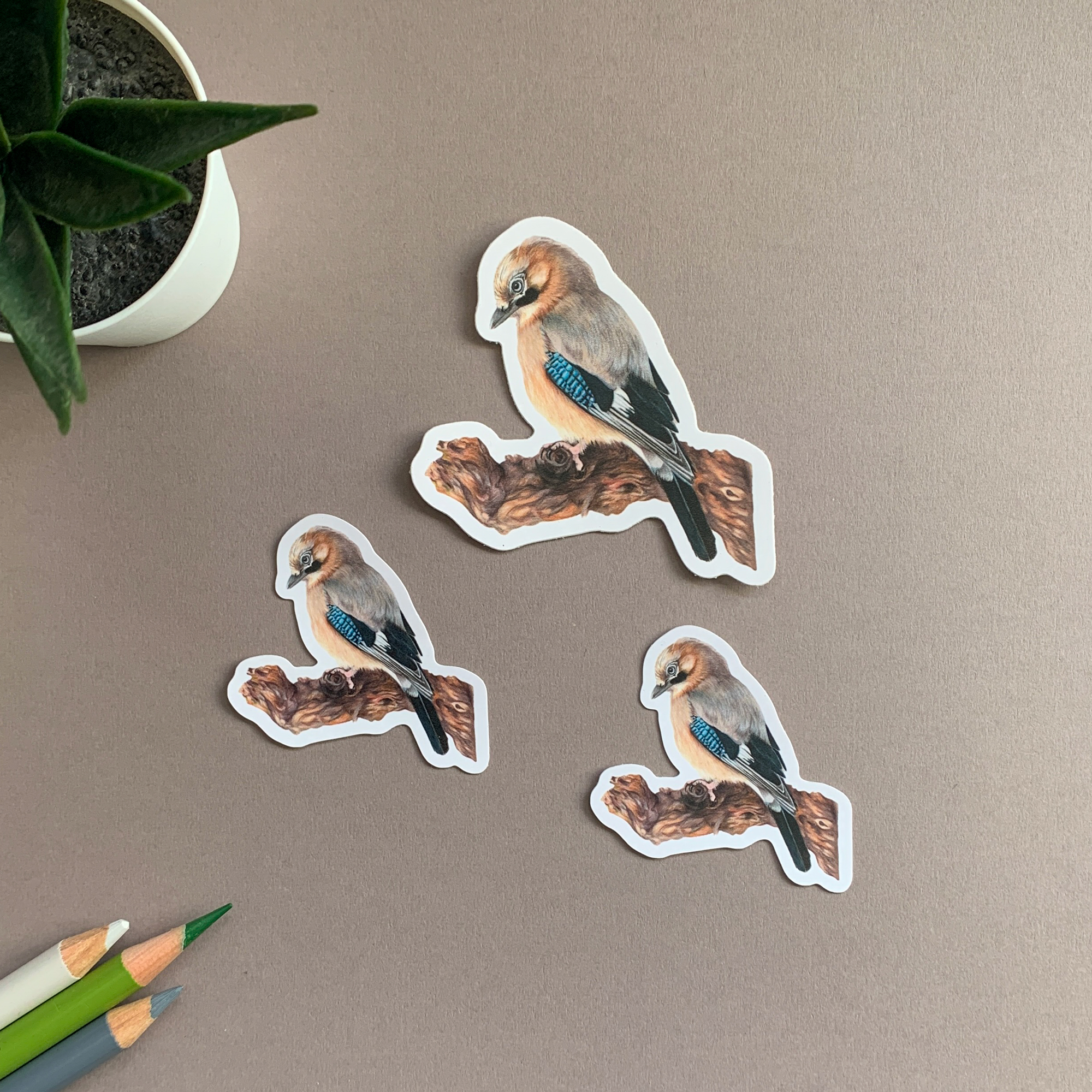 A set of three, durable, glossy vinyl stickers of Terence the Jay Bird. The image is taken from my original coloured pencil drawing.