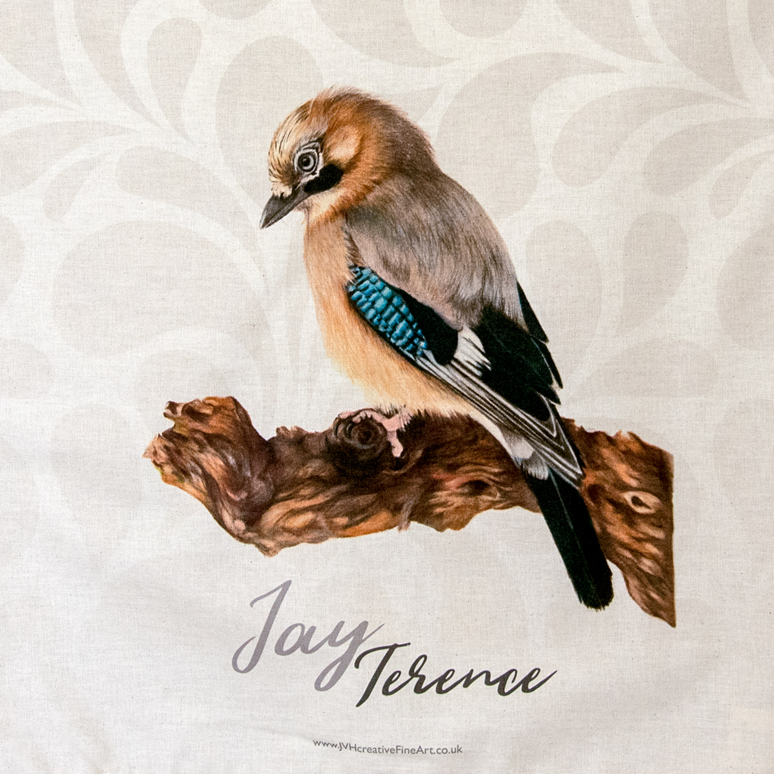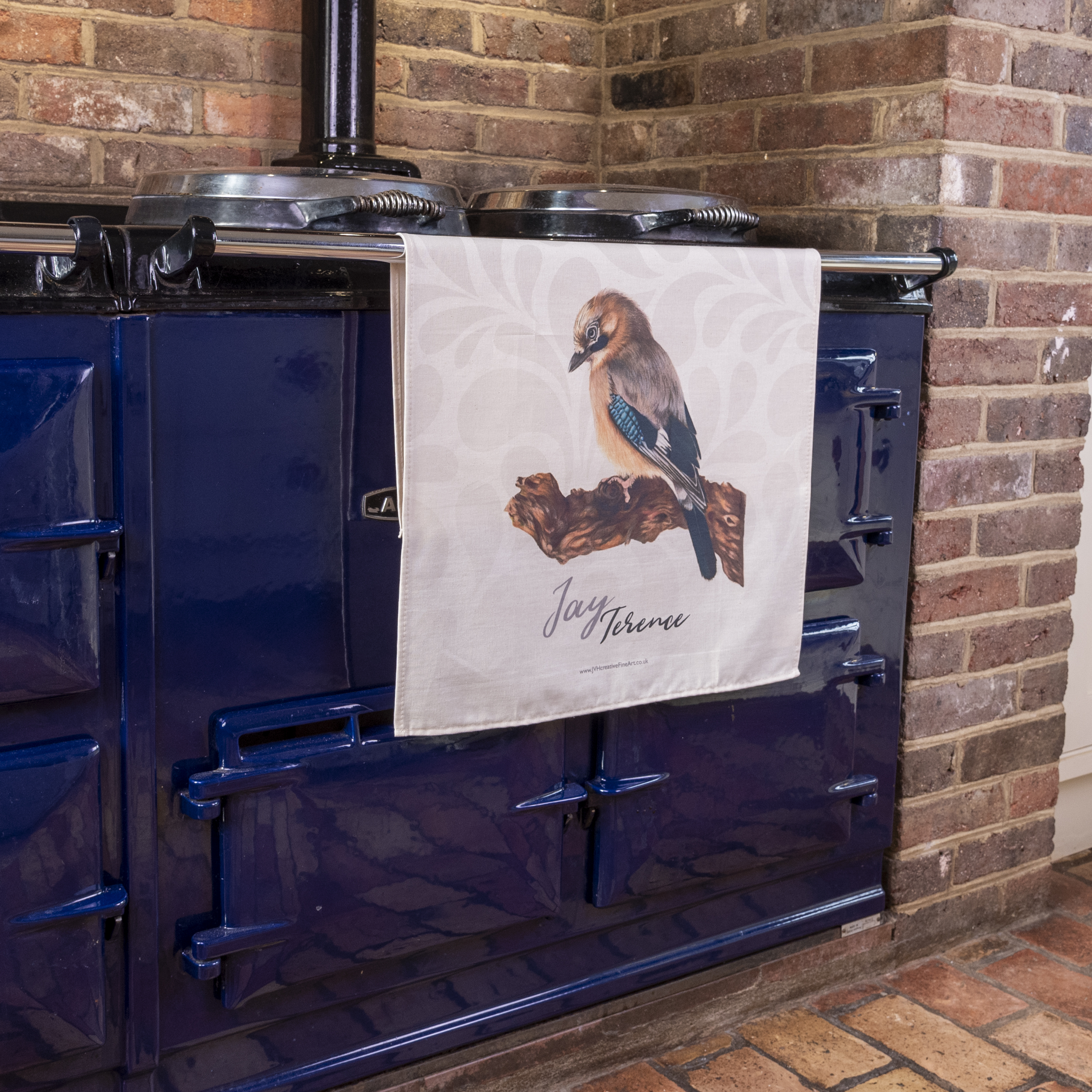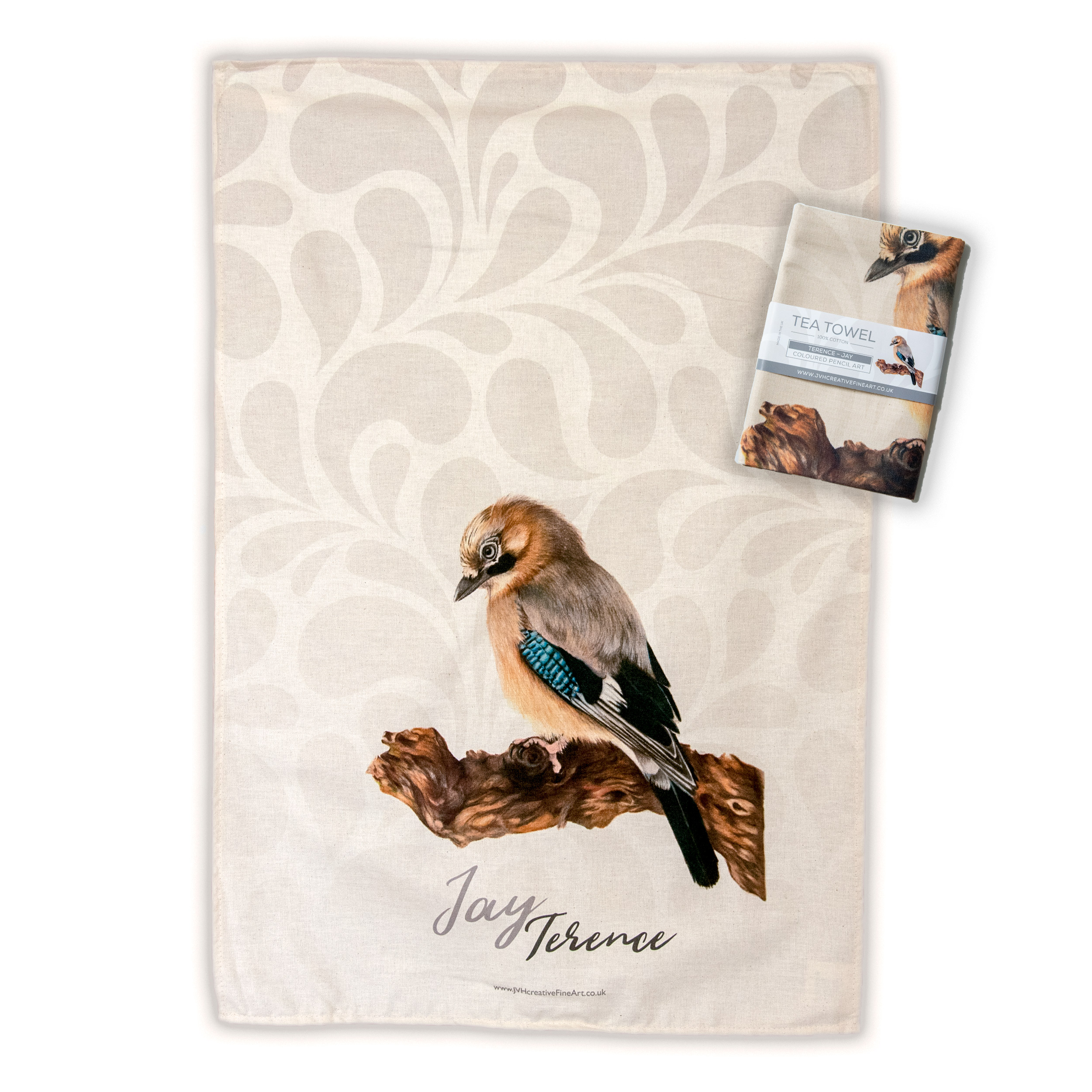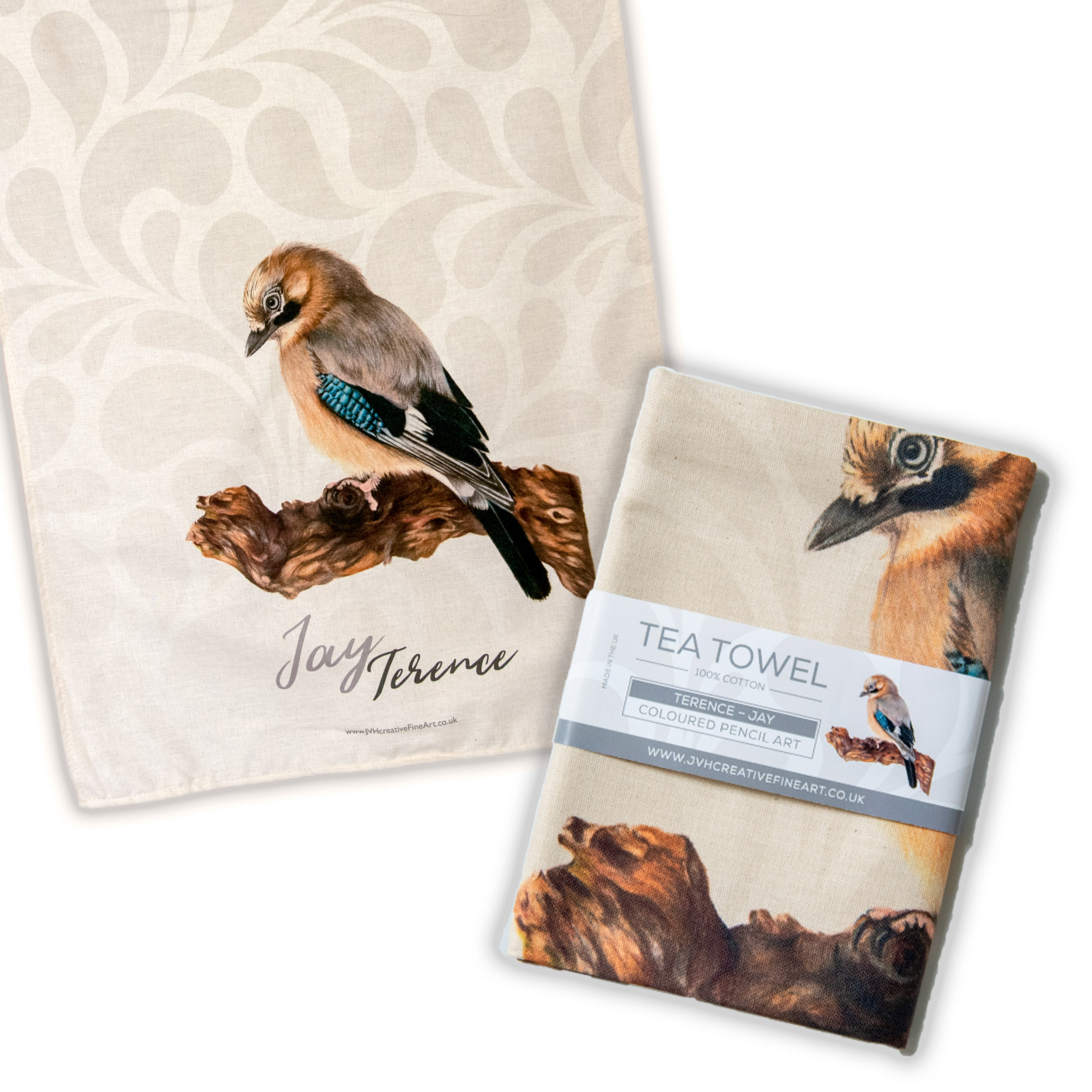 This Tea Towel is made of premium, natural coloured cotton. It features a print of Terence the Jay, an original coloured pencil drawing by Jessica Hennig.