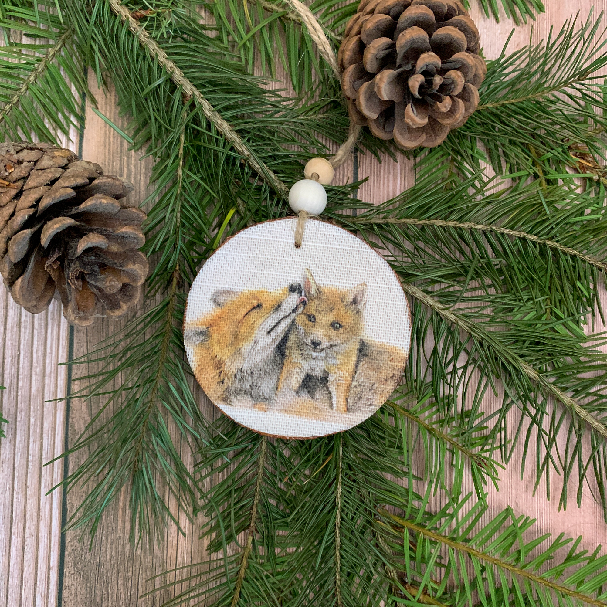 Mother Fox and Cub, Wildlife Wooden Ornaments ready to hang.