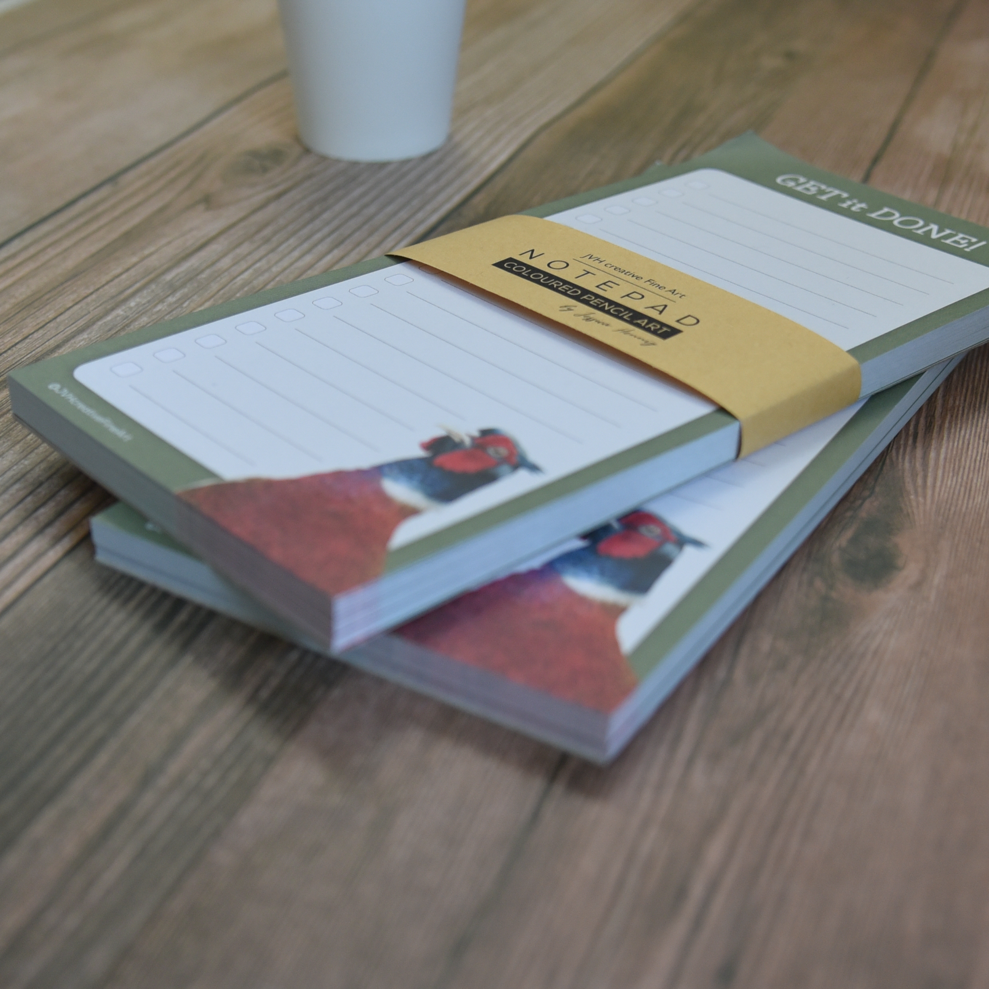 A slim, DL-sized, compact notepad, featuring a print of Phil the Pheasant one of my original coloured pencil drawings on each page.