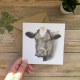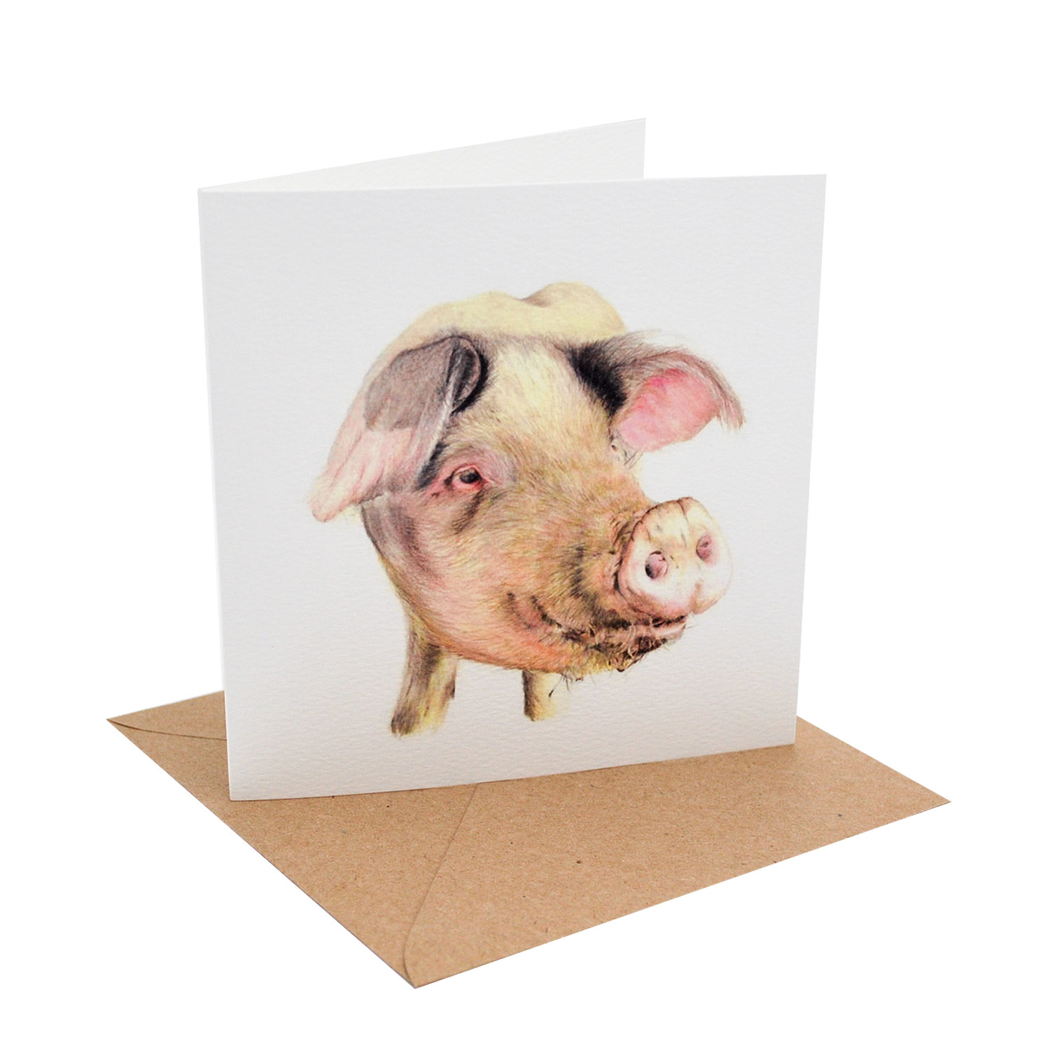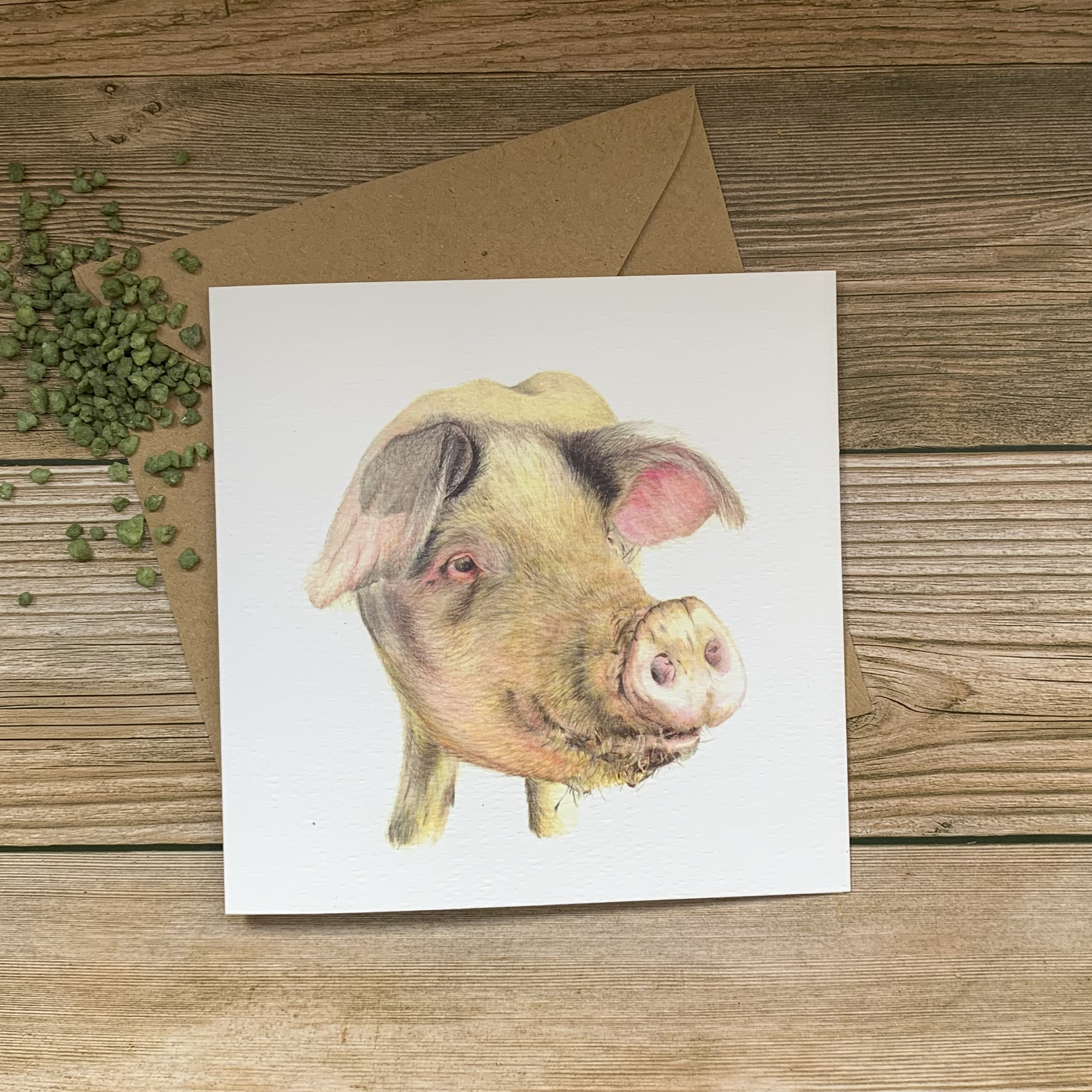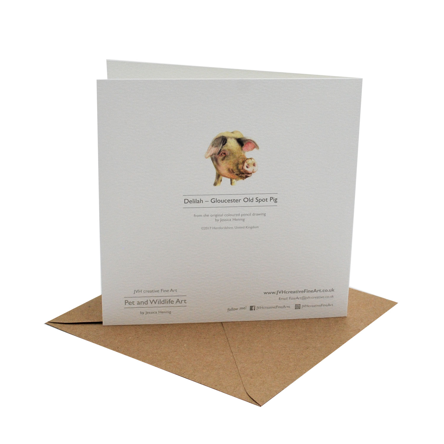 This almost comical greeting card is a print of the authentic drawing of Delilah, the rare breed Gloucester Old Spot Pig.