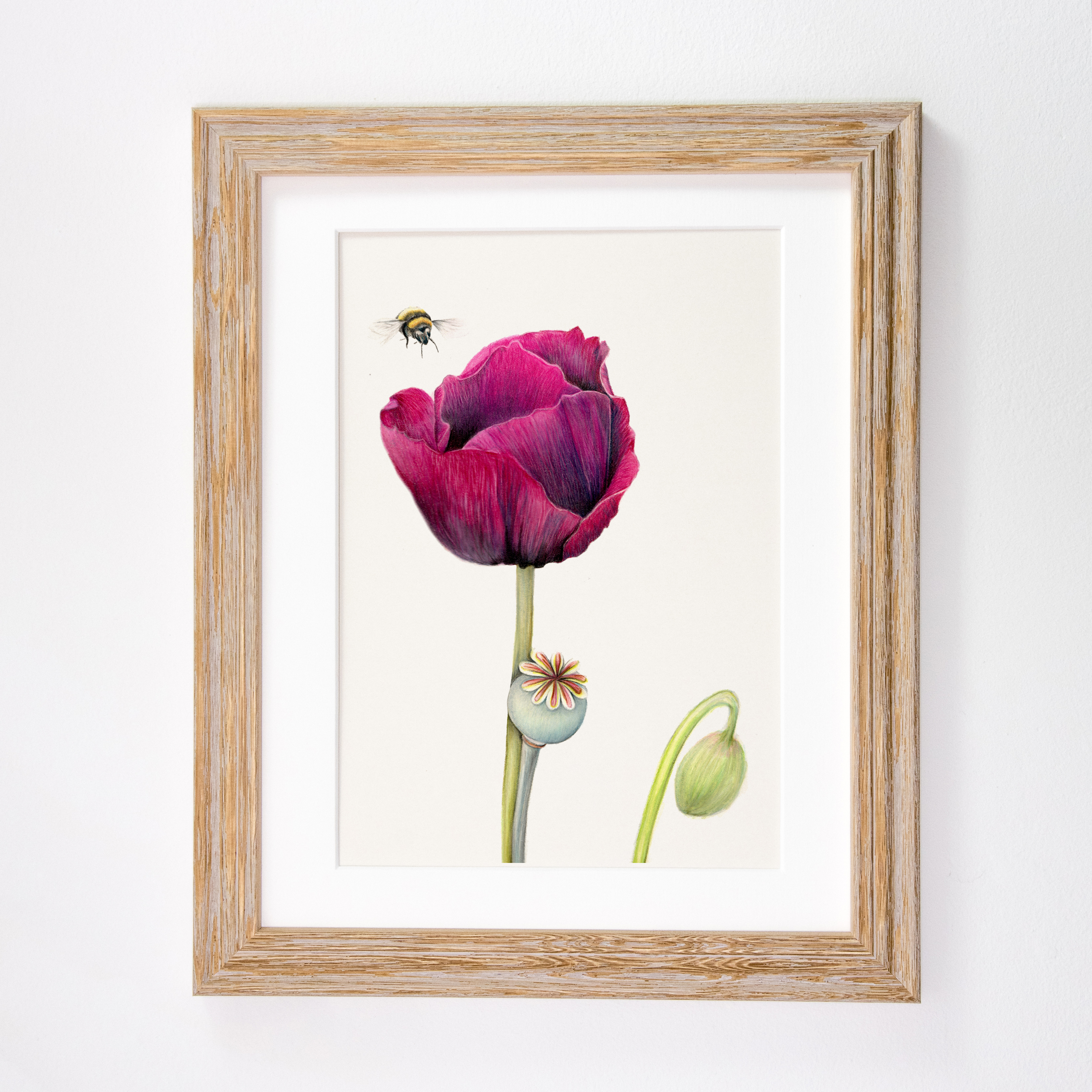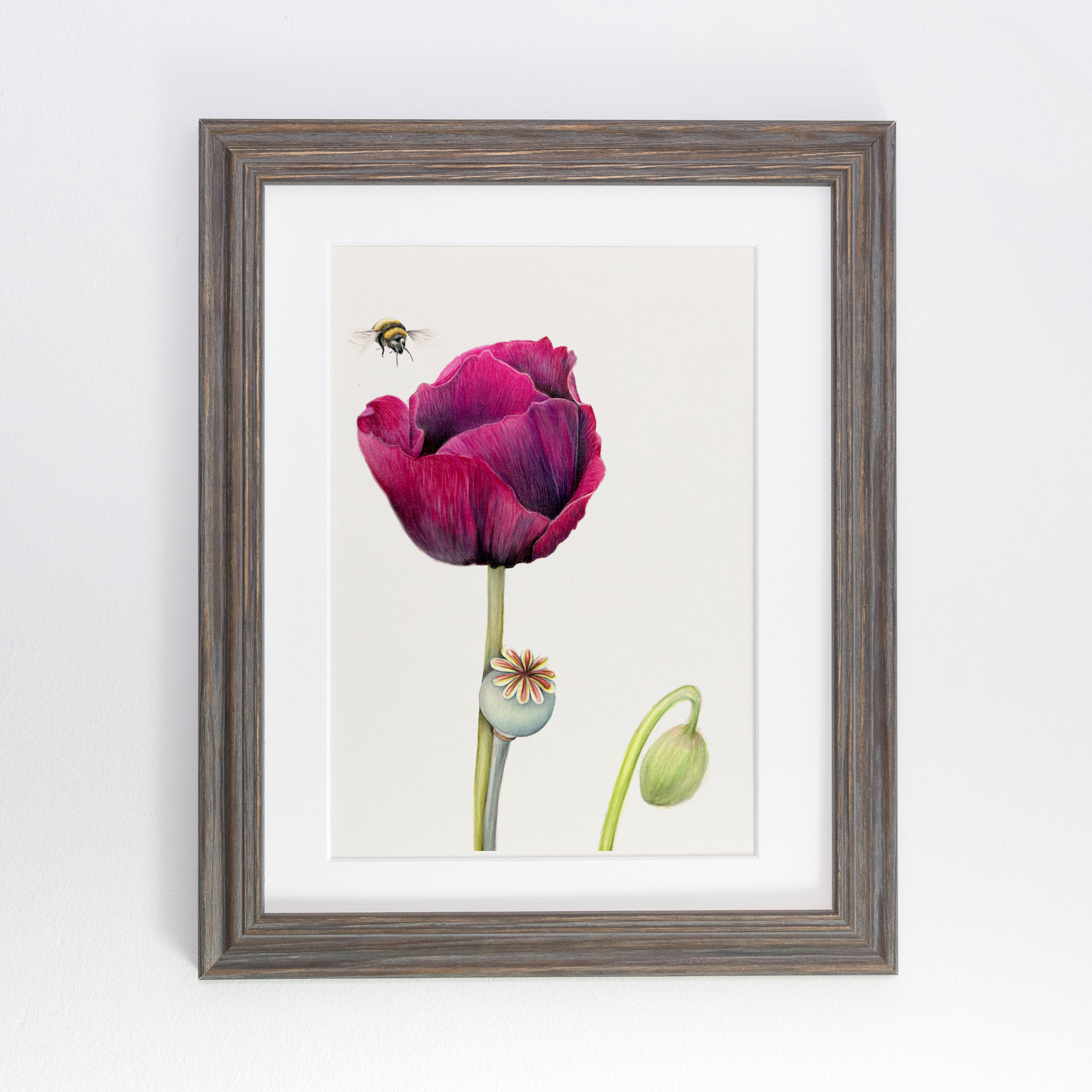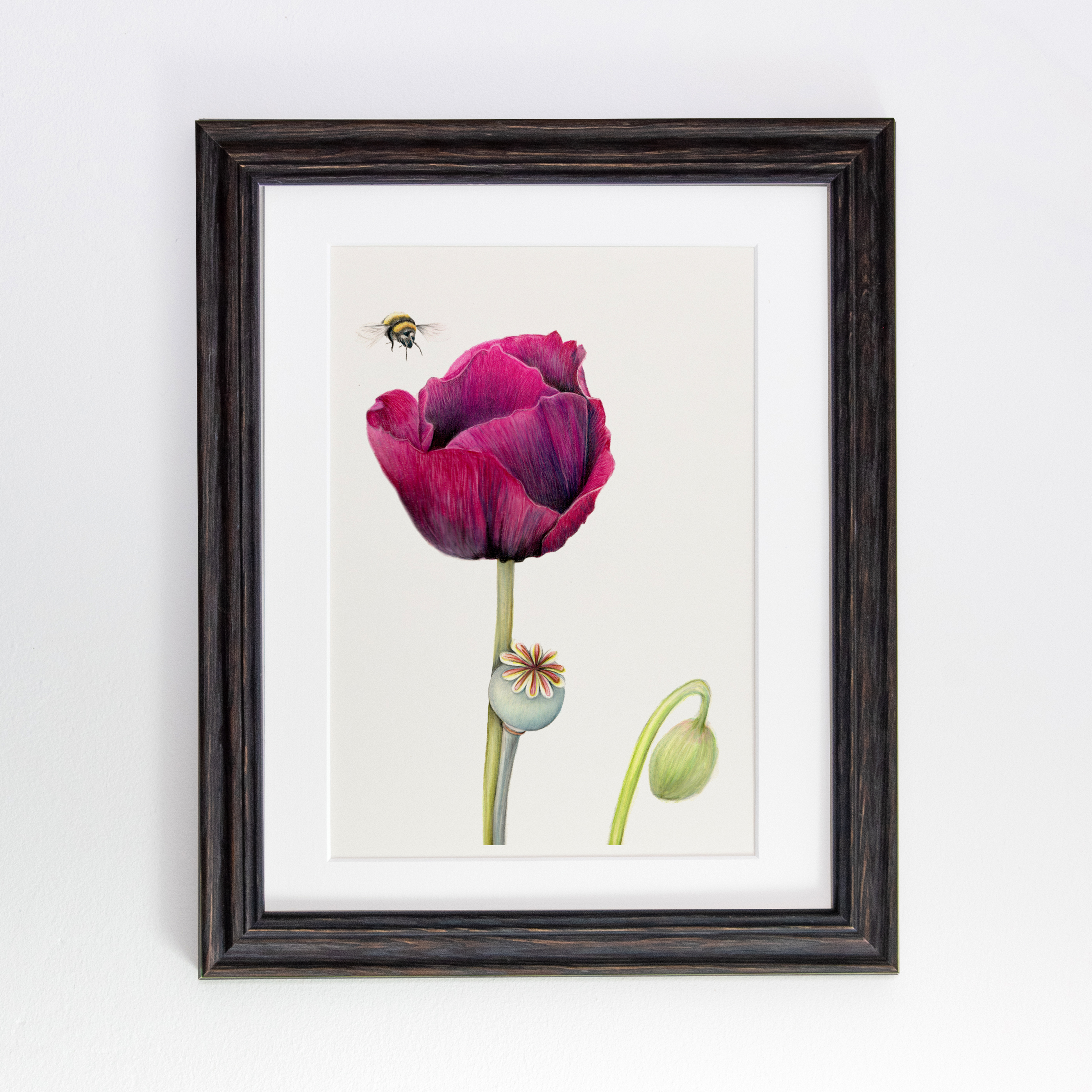 “Poppy Bee” is printed onto a 310gsm archival quality, acid free paper. The paper is of a natural white finish and has a soft textured surface.