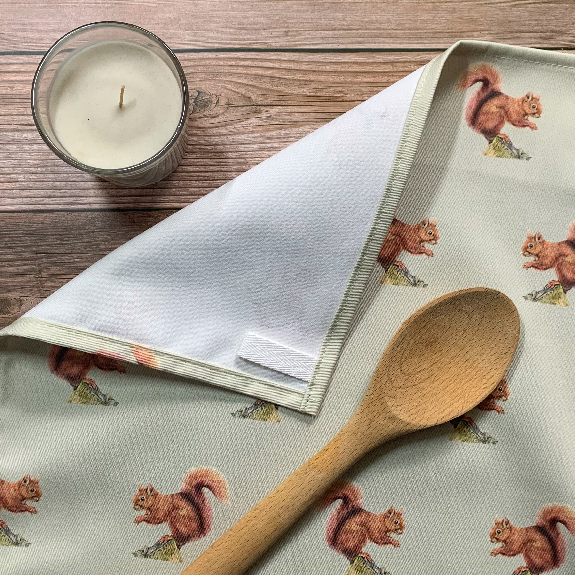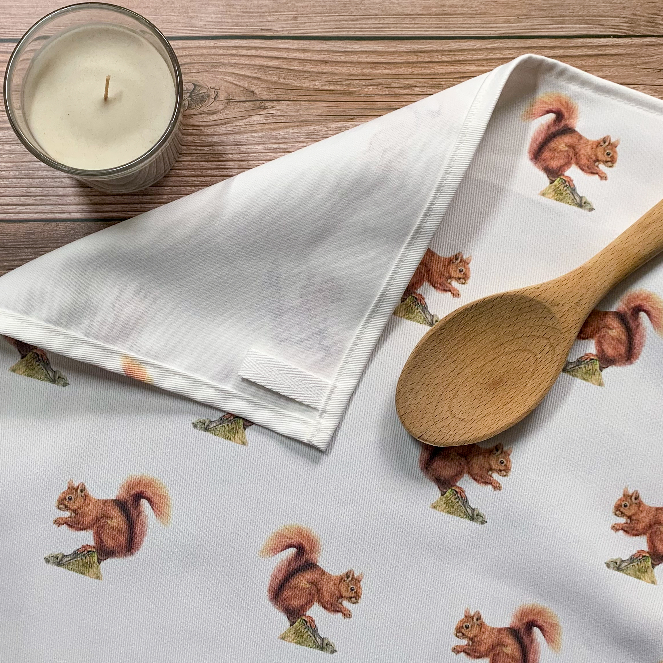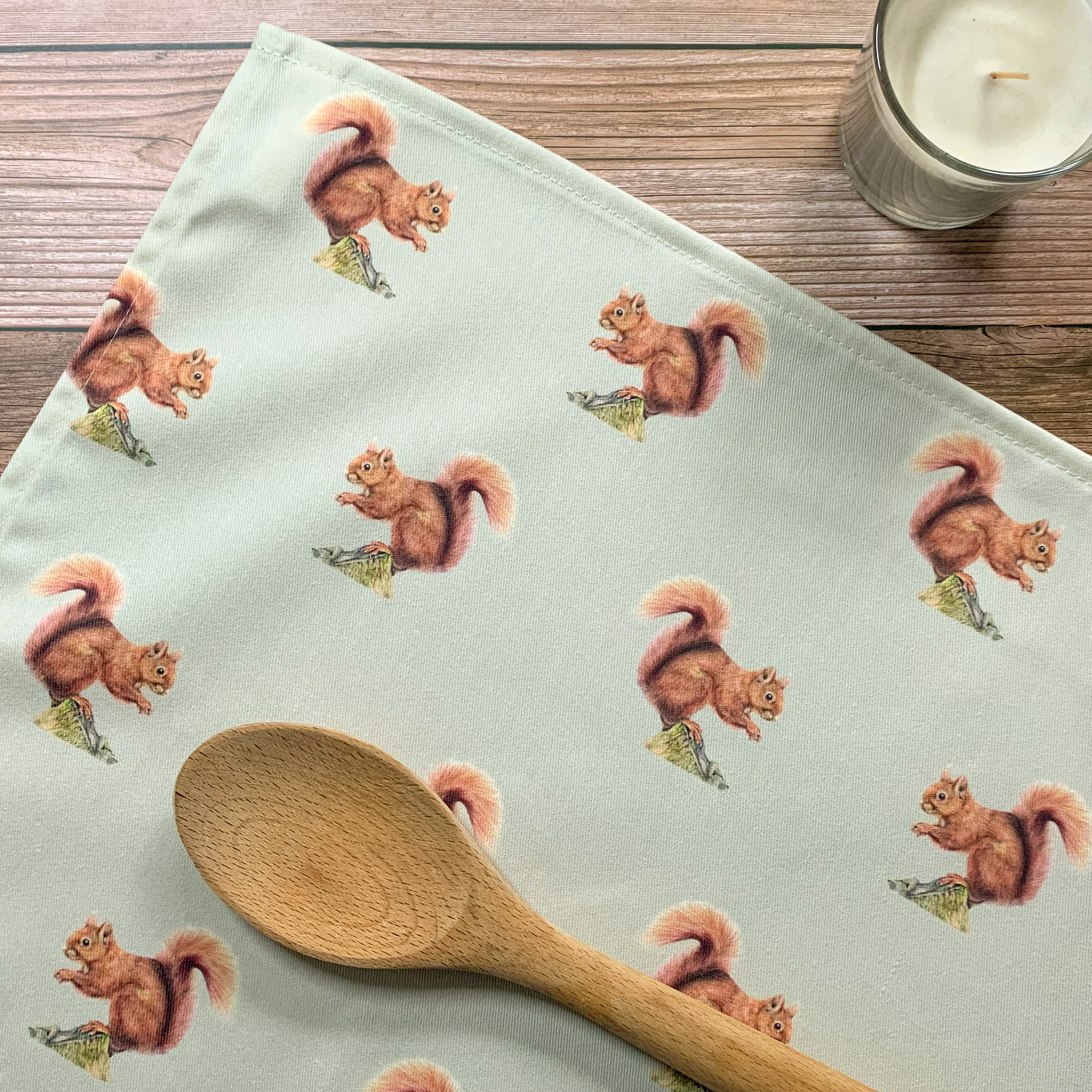 This Tea Towel is made of premium, white cotton drill. It features a pattern print of Sammy the Red Squirrel, featured on a light green or plain white background. Taken for one of my original coloured pencil drawings.