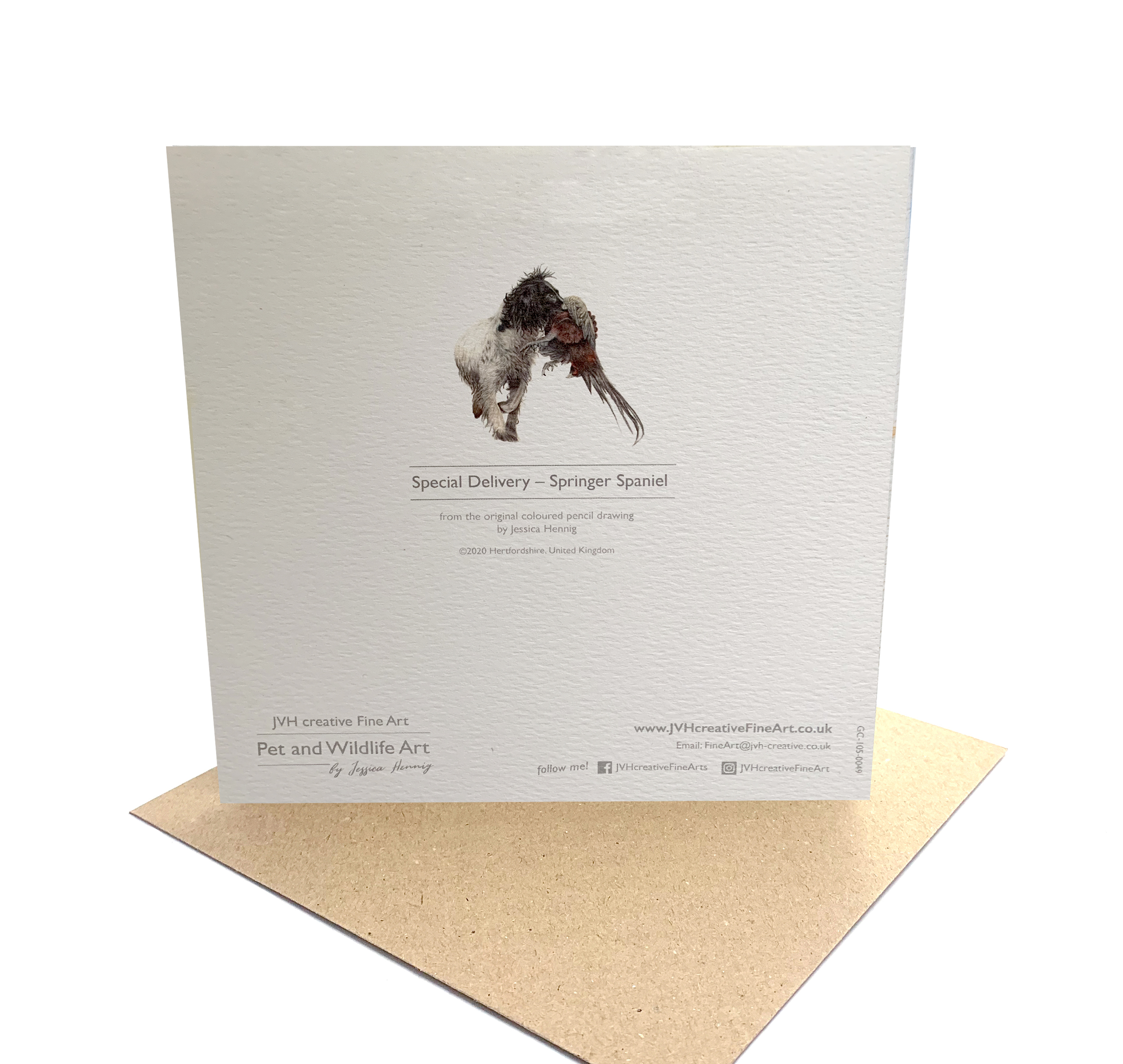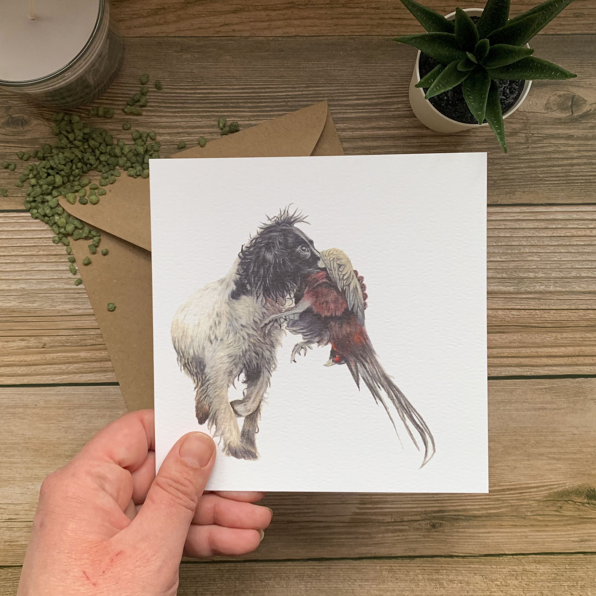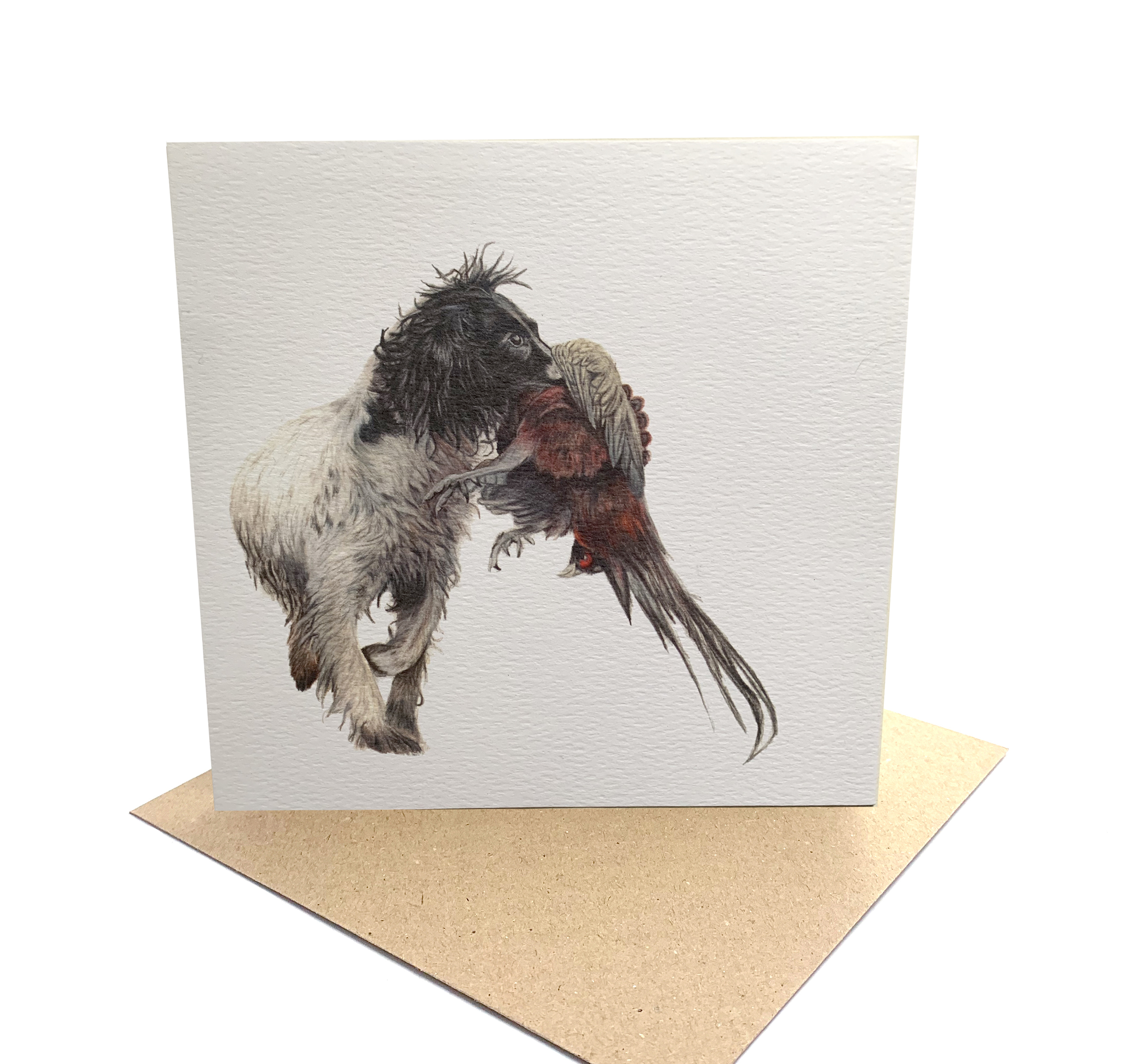 The coloured pencil drawing “Special Delivery” is featured on this high quality Greeting Card. It features a black and white Springer Spaniel, at work, picking up a Pheasant.