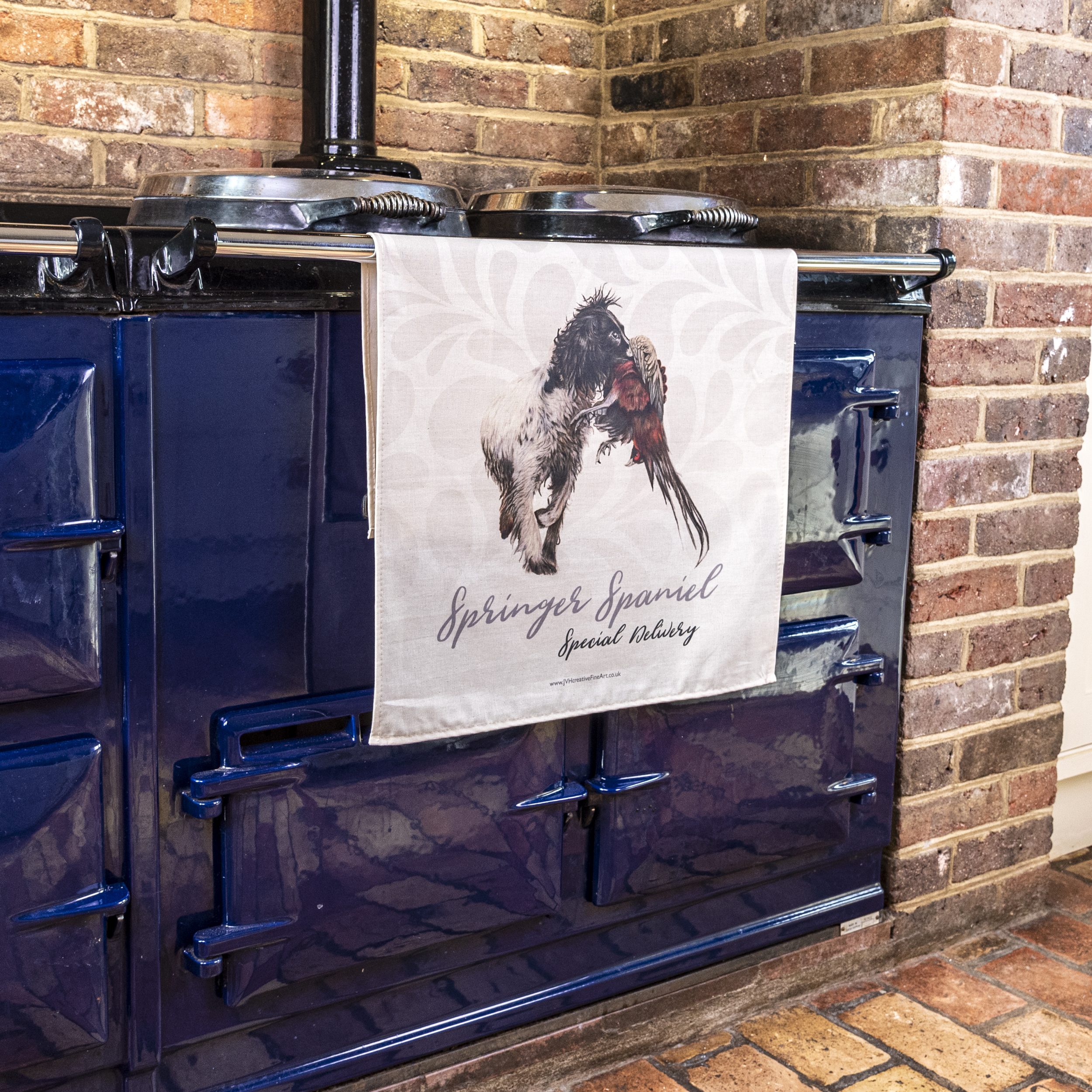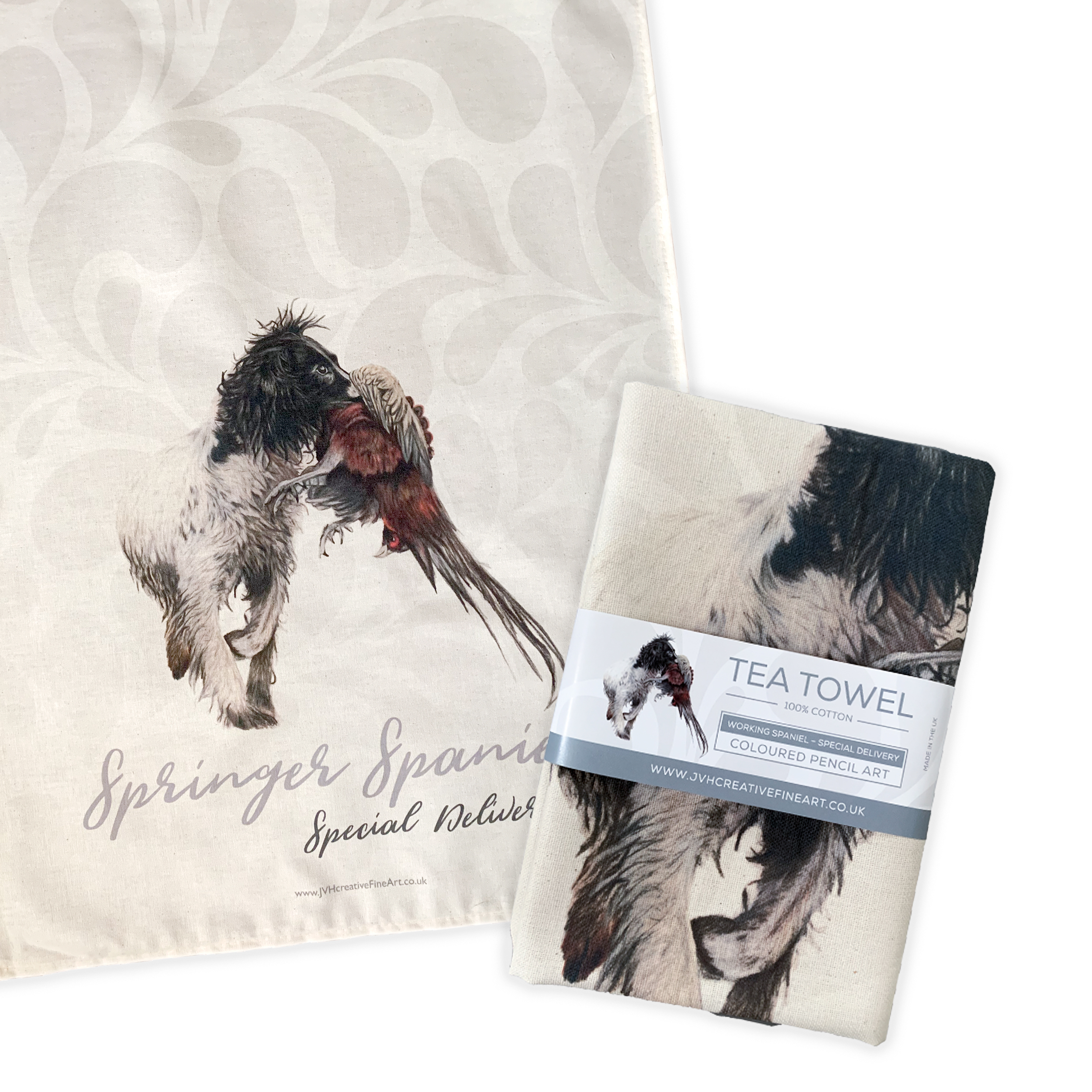 Special Delivery is the name of the original coloured pencil drawing of the Springer Spaniel. These large Tea Towel makes a great gift for all country people, from hunting enthusiasts, game keepers and field sport lovers.