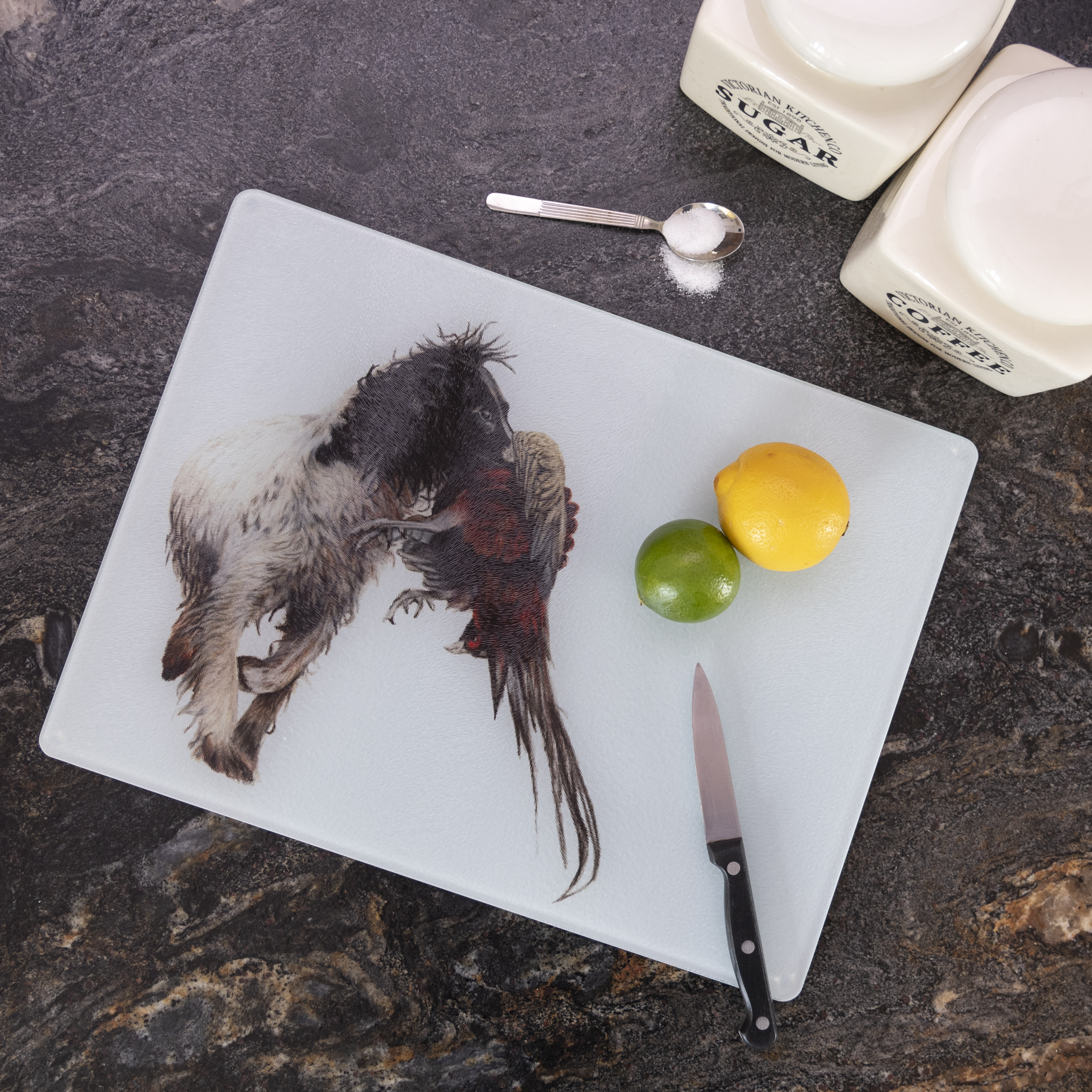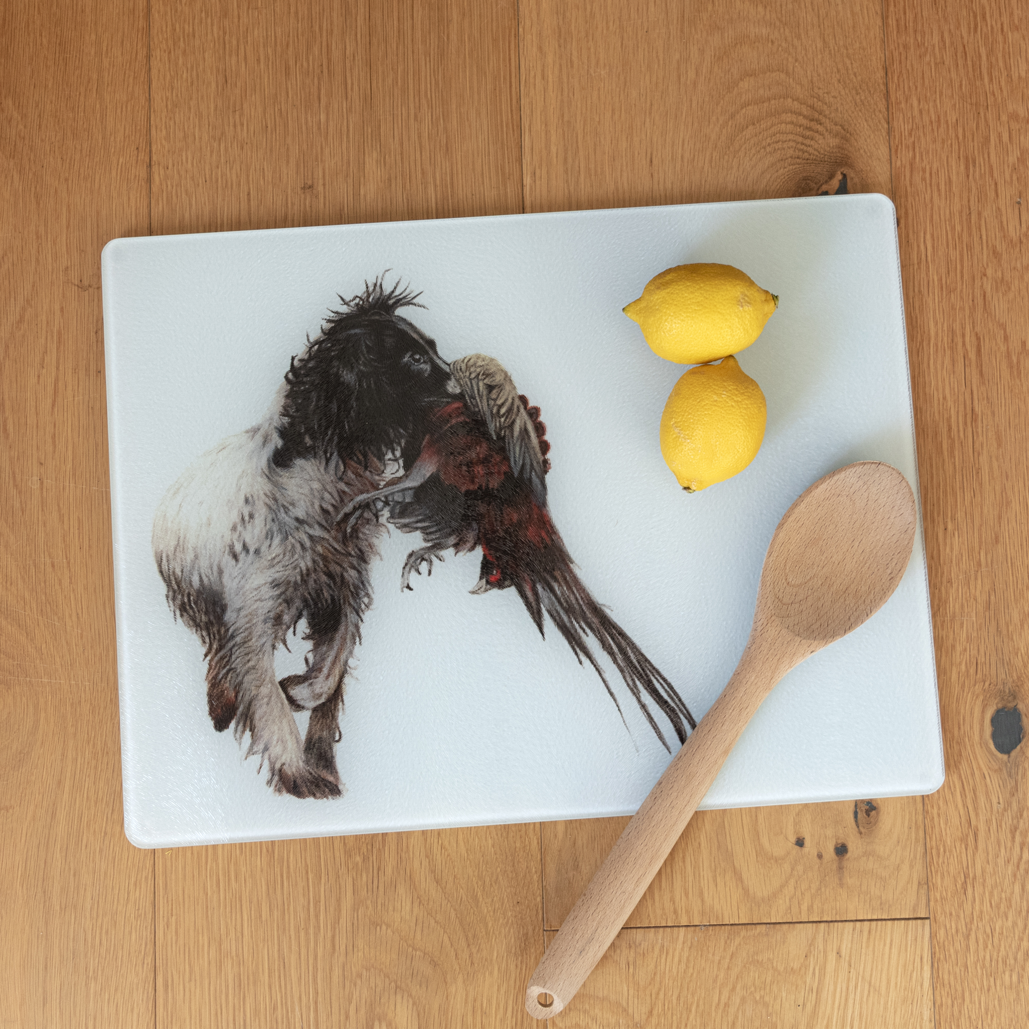Special Delivery the Working Spaniel a colourful original coloured pencils drawing and featured on these extra large Worktop Savers, quaranteed to add some colour to your kitchen or dining room.