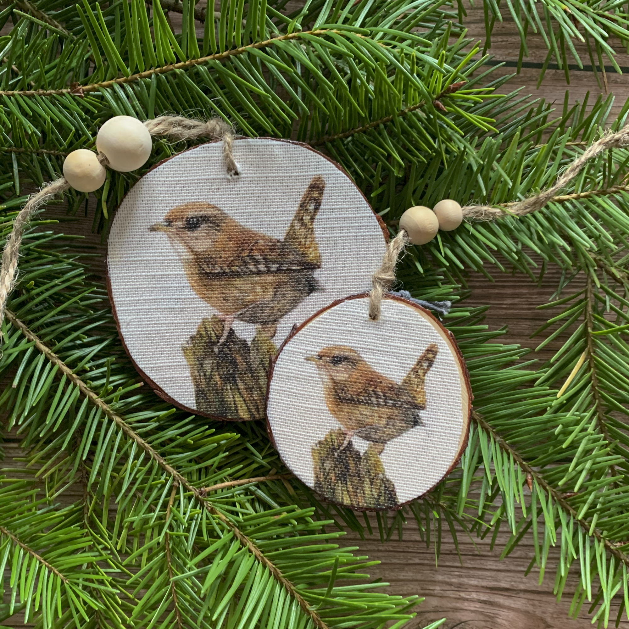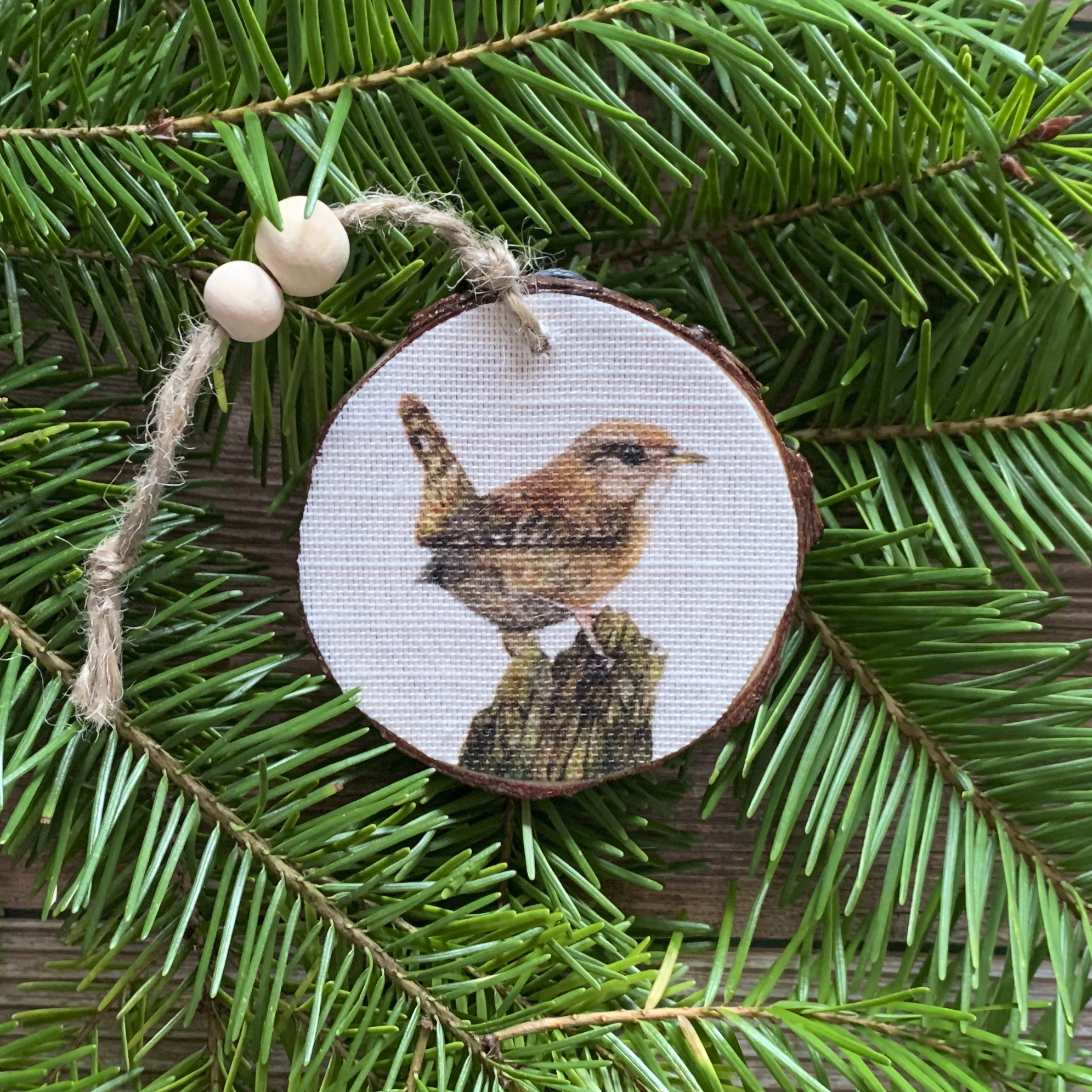 These natural wooden are decorated with custom printed cotton fabric on both sides. The fabric features the print of my original coloured pencil drawing of Wilbur the Wren.