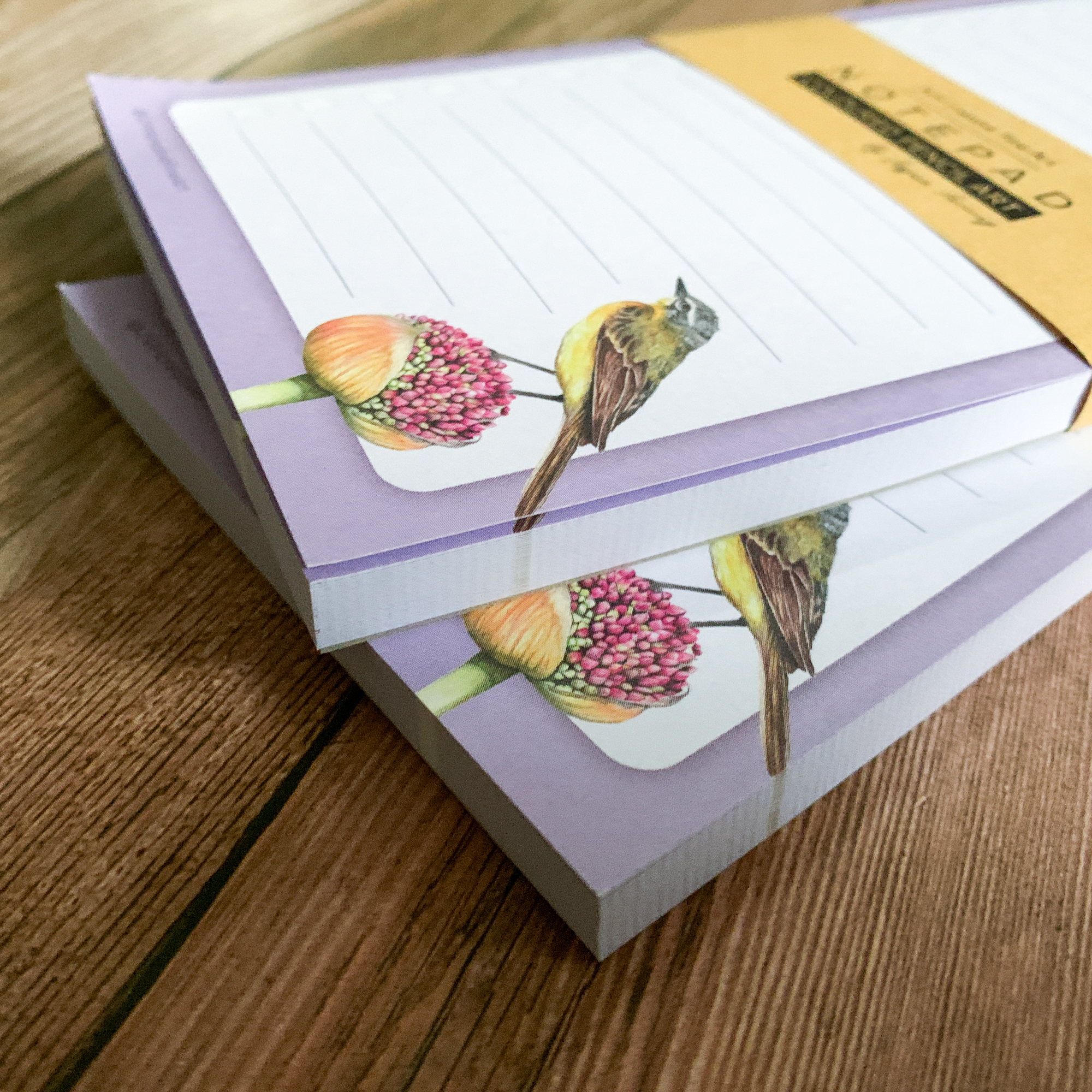 A slim, DL-sized, compact notepad, featuring a print of Yannis the Yellow Wagtail on Allium one of my original coloured pencil drawings on each page.